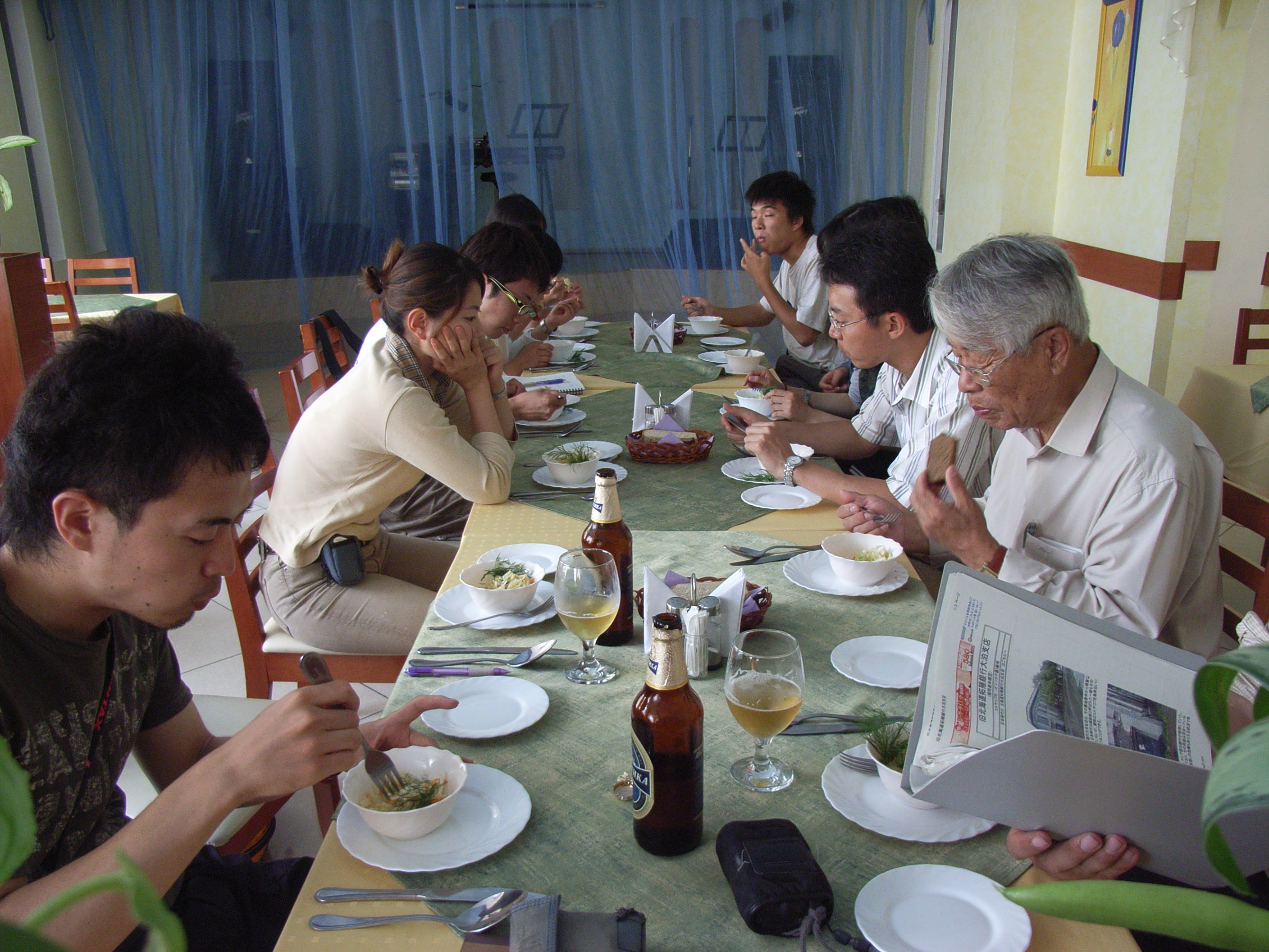 店内は空いており、高級であるため地元の客は全くいないようである。私たちの他に日本人客が一人おり、他の客もすべて東洋系の顔をしていた。メニューの中にはロシア風お粥とでも言おうか、白くてドロっとしたものもあった。珍しいので食べてみたが、あまり口には合わなかった。その他はパンや生野菜、ソーセージ・ハムなど日本と共通するものがほとんどであり、美味しくいただいた。ゼミ生はゆったりとコーヒーを飲みながら一服したり、持参していたノートパソコンを開いて久しぶりのメールチェックをしたりなど、これまでの1週間近いハードな日程をおえて、ほっと一息、思い思いに優雅なときを過ごした。