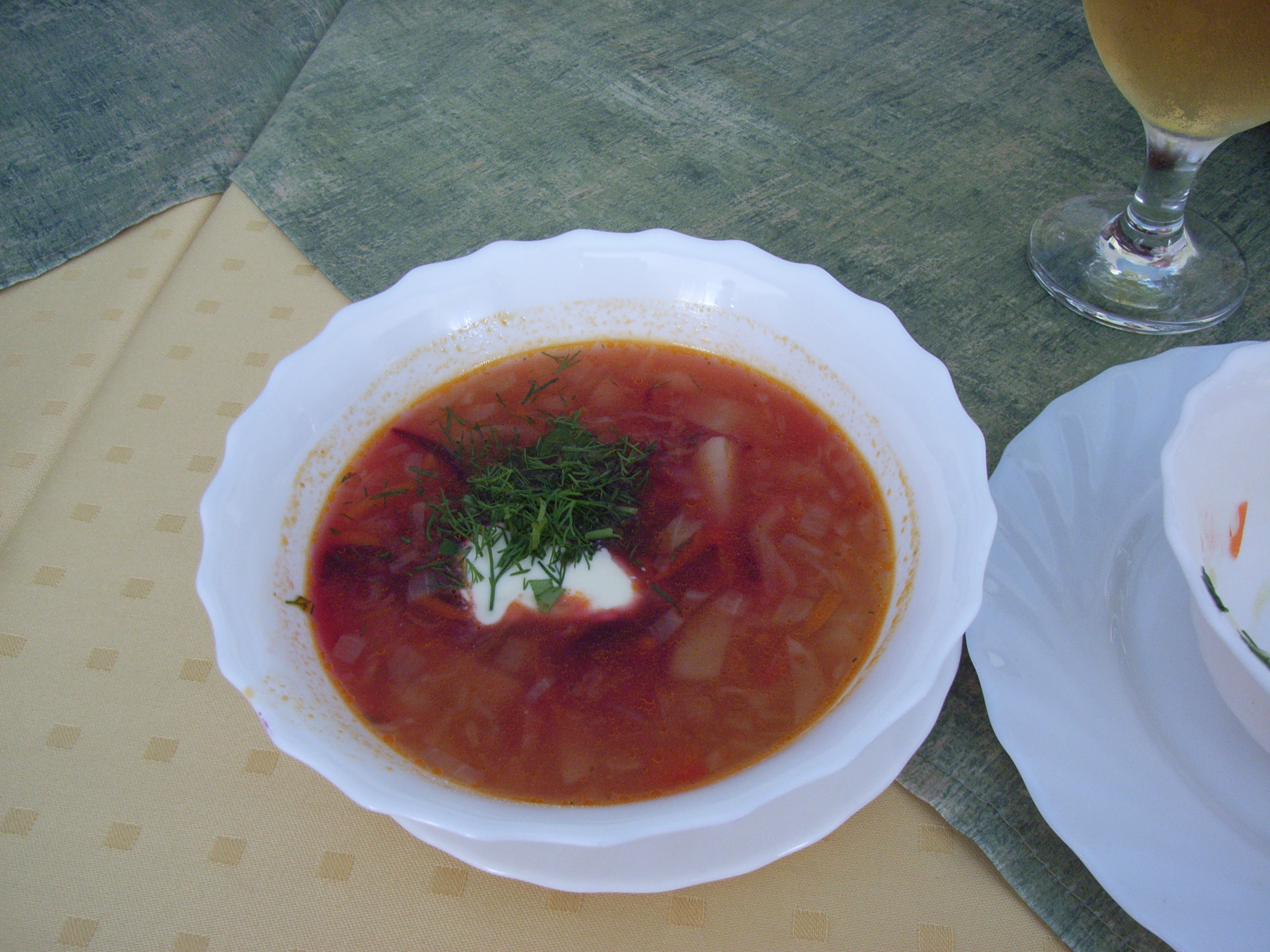 スープは60ルーブル前後、冷製スープ、ボルシチ、そして日本では見られない赤いビートのスープの三種類があった。この昼に出された料理は、サラダとパン、スープ、さらに魚料理であった。気が利いていて、値段がそれほど高くないのもよい。ちなみに、暖かいスープには大抵入っているサワークリームは、「スメターナ」と呼ばれている。私たちの大学の近所には、その名をとったロシア料理店がある。