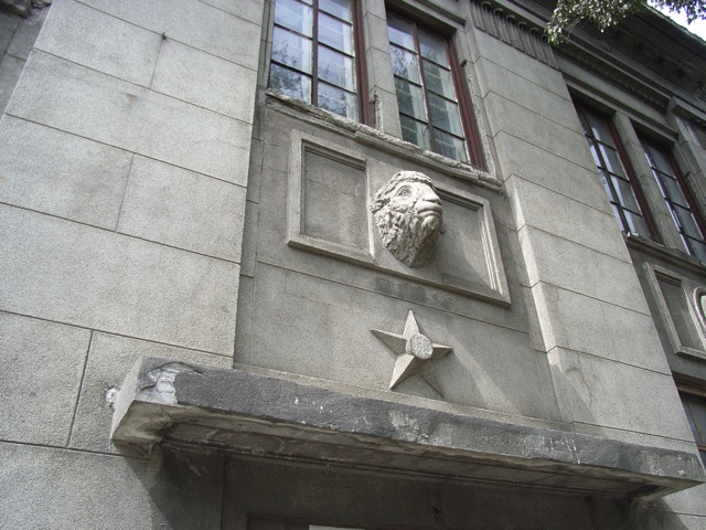 北海道拓殖銀行大泊支店跡は、この都市で日本時代の建造物が残る数少ない例である。古典的デザインの重厚な石造り二階建てである。ドアの上の壁には不自然にコンクリートで固められた跡がある。ここには、かつて拓銀支店であることを示す文字が書かれていたものと思われる。だが、拓銀のロゴである星印と外壁から飛び出した羊の顔は健在であり、昔の面影を残している。ちなみに、羊は北海道をイメージしたものだそうだ。