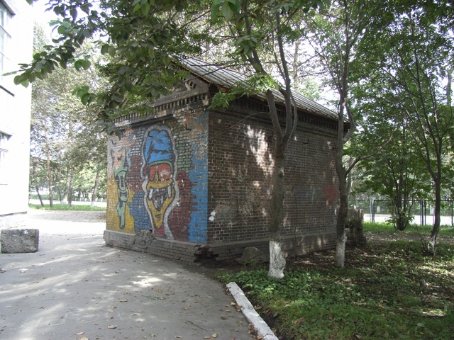 次に私たちが訪れたのは、大泊町立栄町中学校跡である。校舎はソ連時代にそれまでの木造からコンクリート造りに建て替えられたようだが、現在も学校であることには変わりない。現存する奉安殿が、日本時代の面影をとどめている。奉安殿とは御真影(天皇・皇后の肖像)と教育勅語が置かれる建物のことであり、戦前は日本の学校ならどこにでもあった。しかし、戦後は、天皇制支配の解体を目指すGHQの命令によってほとんど全て取り壊された。だが、樺太/サハリンではGHQの影響力が及ばなかったために、逆に奉安殿が取り壊しを免れ、今日まで残っているのである。戦前の奉安澱の実物を見たければ、樺太/サハリンまで来なければならないとは、皮肉な話だ。