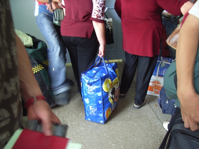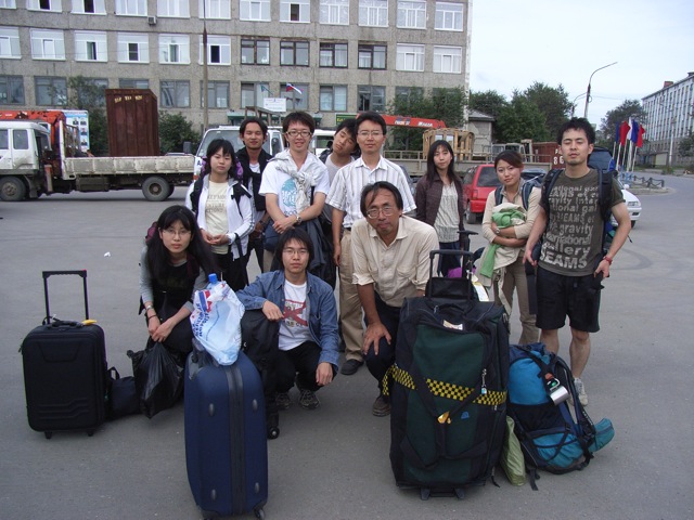 それにしてもこのロシア人たちのの荷物の量がすさまじい。我々も水岡先生をはじめ、かなりの大荷物を抱えている気でいたが、到底かなわない。ロシア人たちは、単なるカバンのみならず、樺太/サハリンで買いこんできたと思われるシャープのテレビなど家電製品をいくつか持っている。また、大人ばかりの集団であったが、かわいらしいミッキーマウスの絵の描かれたカバンもあった。海賊版かもしれないが、ディズニーの文化がロシアの辺境にまで進出しているというのは、米国主導のグローバル化の象徴ともいえようか。