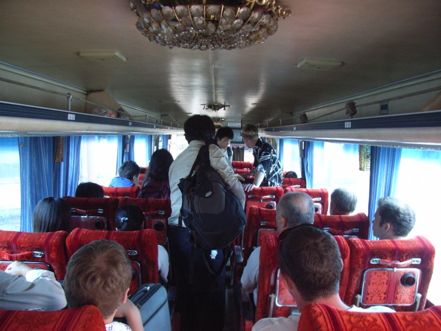 まず、バスの下部のトランクに荷物を詰めた。ロシア人たちの荷物が多すぎたのか、全員分の荷物を入れることができない。そこで私は、キャリーケースを上部の客席に乗せた。ちなみにバスは1週間前に乗ったのと同じ、北海道の宗谷バスの中古であった。バスの中には、かつて日本で使われていたときの名残で、「化粧室」という札がついていた。もちろん、今は使えない。また後部の非常口横の座席は取り外され、ここからも乗り降りできるようになっていた。