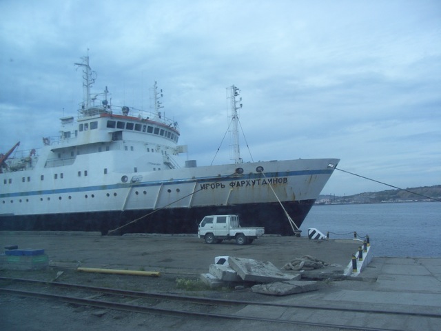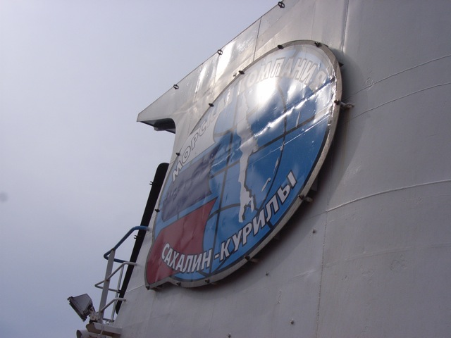 乗り場に到着してバスを降りると、早速乗船である。船は、稚内からのフェリーよりも断然大きい。船の下部は青、上部は白に塗装されており、その白い部分には、キリル文字で「イゴール・ファルフトディノフ」と書かれている。この船名は、カムチャツカ半島上空の飛行機事故で無念の死を遂げた、前サハリン州知事の名前から記念に採られたものである。前知事は、大変に人気のある政治家だったようた。