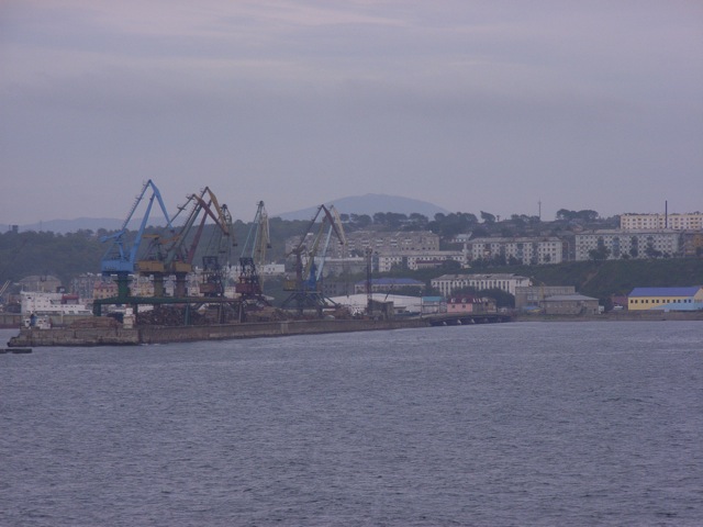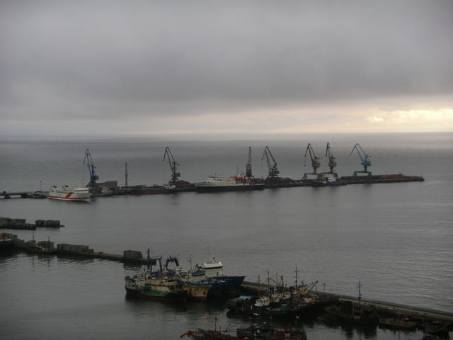 道路の海側は港湾地区となっており、倉庫やクレーンが立ち並び、トラックが停まっている。その中には「サクラ」という名の店もあったが、見た感じでは特に日本と関係はなさそうである。また、「コルサコフ港…60周年」と書かれた派手な看板もあった。おそらく1945年の南樺太/ユジヌイ・サハリンをソ連が実効支配においてから60周年を記念するものだと思われる。ちなみにこの看板は港付近の至るところで目にした。他のところにあったものには、過去5年間での港の輸送量の急激な増加を示しているようなグラフが描かれていた。