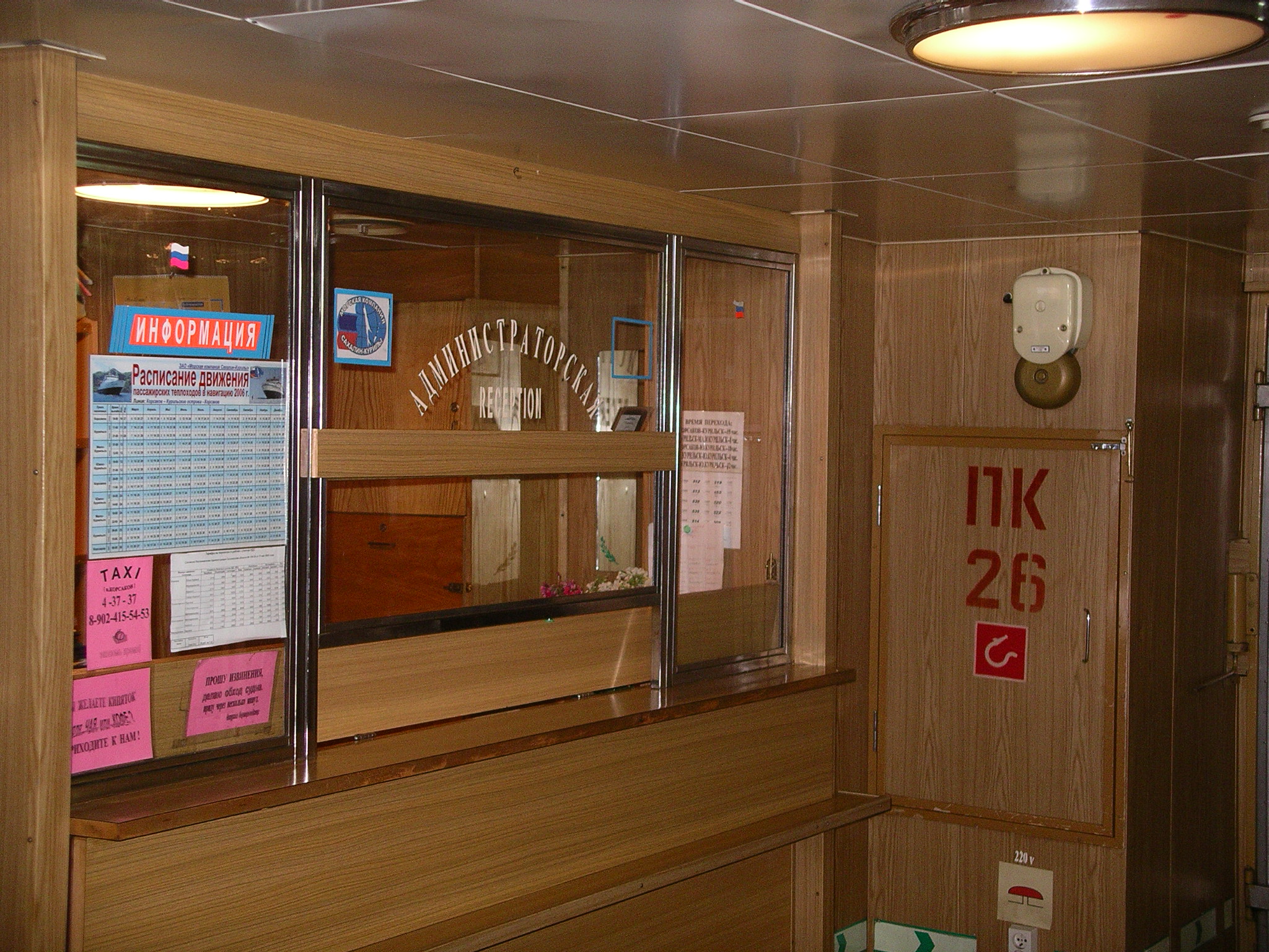 しばらくすると私たちは、成様から乗船券を受け取り、券の確認所を順に通過した。券は緑色の薄い紙で頼りない感じではあったが、キリル文字で「Южно Курильск」(ユジノクリリスク/古釜布)と行き先がはっきり書かれているのを見て、感動を覚えた。運賃は片道2,900ルーブルであり、別途シーツ代として船内で90ルーブル徴収される。稚内から到着した際にこの辺りに置かれていた荷物チェックの機器は、隅へ退けられていた。