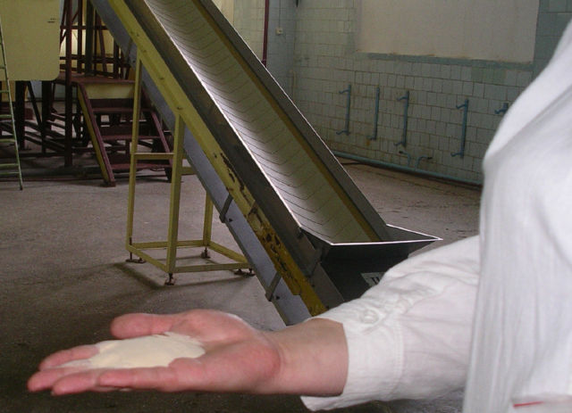 固体は大きなタンクに入れられ、水分が絞られて最後には板状になる。これには16時間かかる。そして板状になったものは120度の高温で乾燥させられて、粉状になる。この粉が製品である。技術者の方はその白い粉を手に乗せて私たちに示してくれた。全工程には7日間かかるそうである。