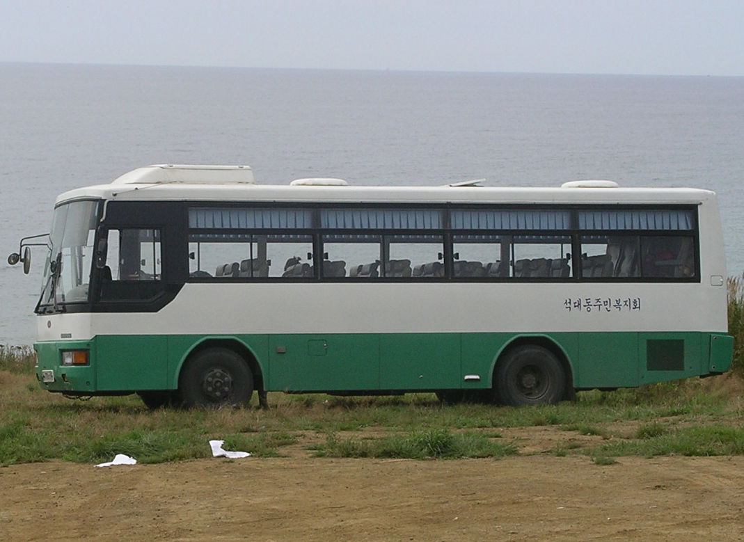 私たちがこの日乗る自動車がそこで待っていた。日本であれば路線バスにでも使われそうなくらいの大きなバスであった。われわれの荷物が大きいので、今回はこのバスが手配されている。これは韓国からの中古車であるらしく、緑と白のツートンカラーの塗装の上にハングルでなにやら書かれている。一方、バスの中は両側2列ずつシートが並んでおり、マイクロバスのような雰囲気である。私たちは持っていた荷物をそこに乗せ、さらに、豊原/ユジノサハリンスク滞在時に泊まっているモネロンホテルに預けていた荷物も引き取って、バスに載せた。