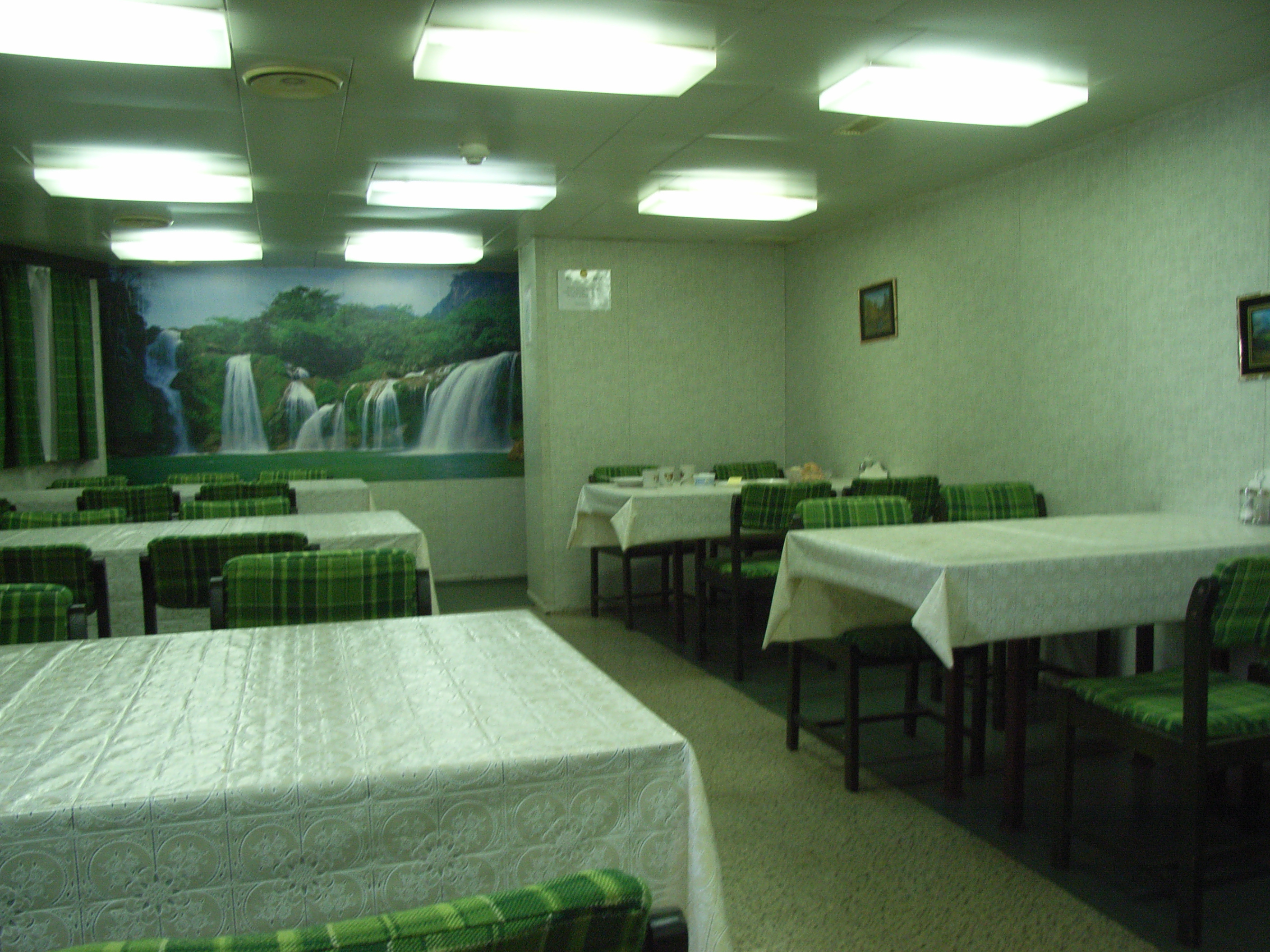 食堂は、窓が4つほどあって電灯も多く取り付けられており、明るい印象である。テーブルは全部で7つあり、一度に36人ほど利用できる。壁には絵が飾ってあったりするが全体として簡素なイメージだ。それでも、清潔感があり好感が持てる。