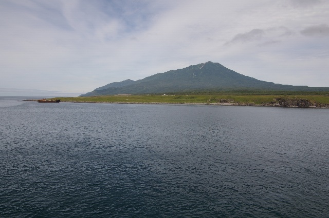まず、進行方向右手奥には、プリンを少し傾けたような形の阿登佐岳/アトサヌプリ(1205m)。そのすぐ左には、択捉/イトゥルップ島最高峰の西単冠/ストカップ山(1634m)に始まる連山が広がり、この連山の向こう側に単冠/カサトカ湾がある。旧日本軍はこの湾に集結し、そこからハワイの真珠湾/パールハーバーへと侵略戦争の一歩を踏み出したのだ。そのとき、誰が、5年後に日本がこの島の実効支配を失っていると予想しただろうか。