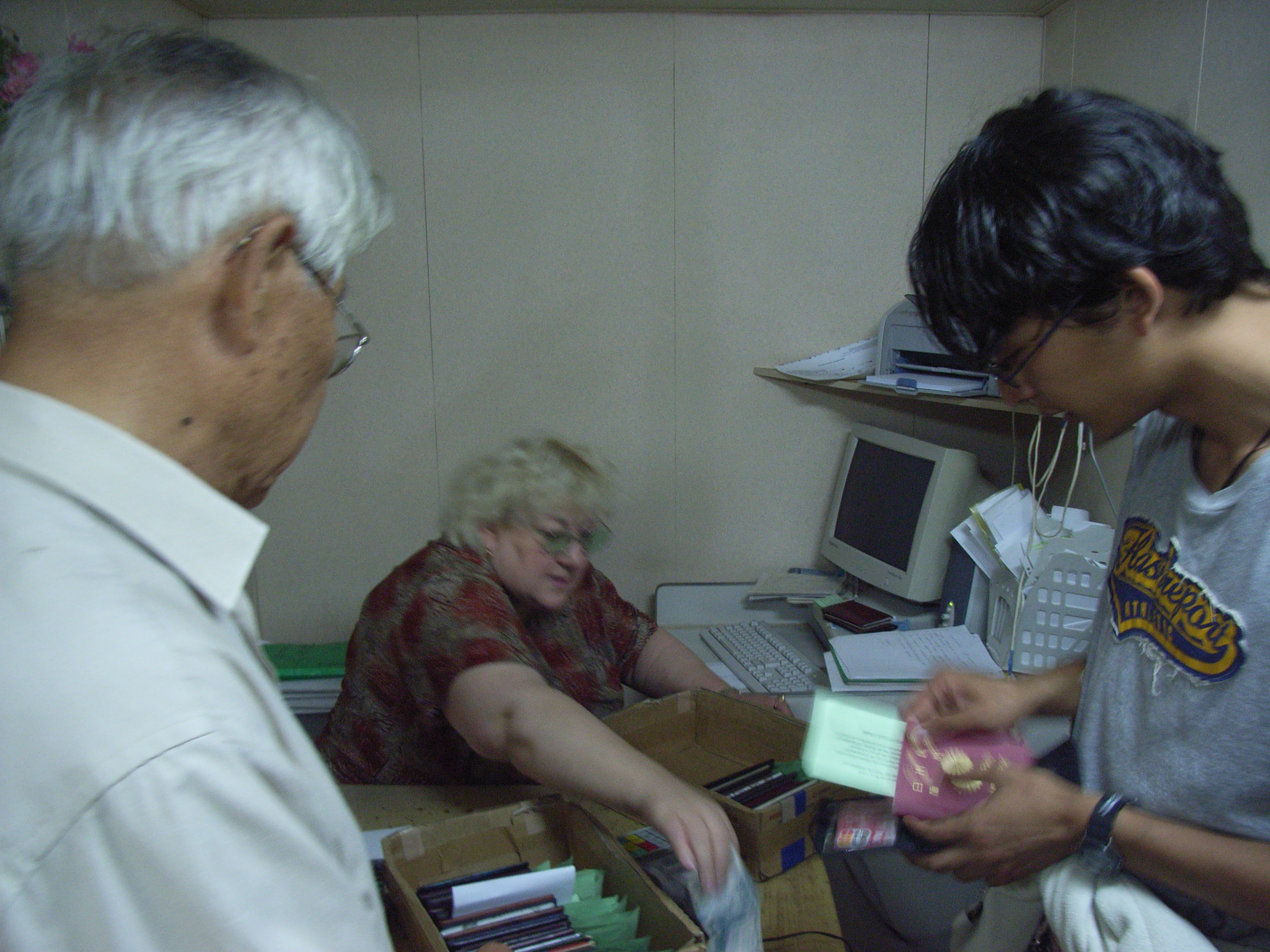 食堂を離れた私たちは、シーツ代90ルーブルを支払って、パスポートを返してもらうことにした。その窓口は、朝食券を買った部屋だ。意思が通じるか不安だったが、「パスポルトゥ」と言ったら日本人のパスポートをあるだけさっと用意してくれた。またもや、この女性の手際の良さに助けられた。少々無愛想なところはあったが、私たちが快適な船内生活を送れたのは、この女性とのコミュニケーションが言葉要らずだったことが大きいだろう。手際よい扱いから察するに、この船には、ロシア語を話せない外国人も、それなりに乗ってきているのだと思う。