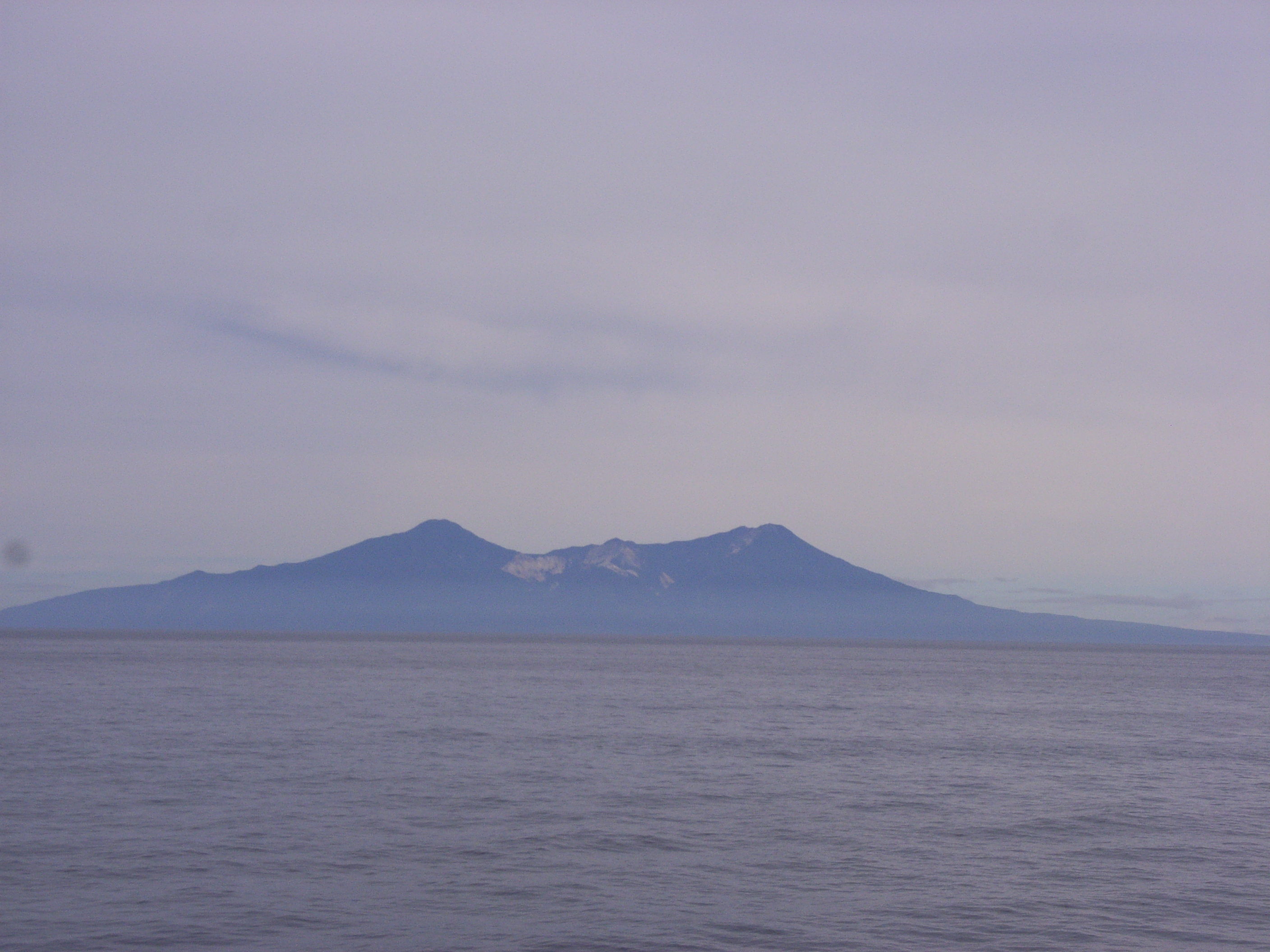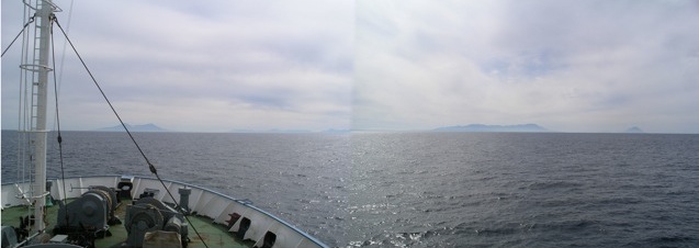 甲板に出ると、晴れ渡ったオホーツク海の水平線上に、左から右まで択捉島の島影がうすく長く広がっていた。択捉/イトゥルップ島は、横に長い形をしている。これが、私たちの船の進行方向、水平線いっぱいに見えるのだ。