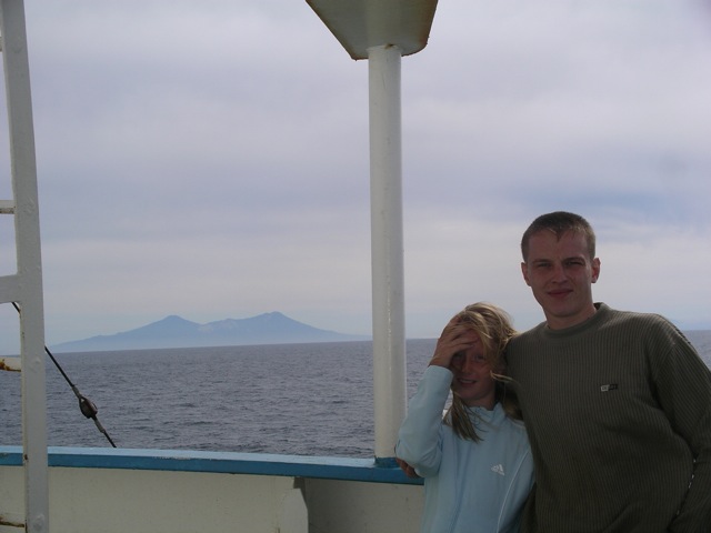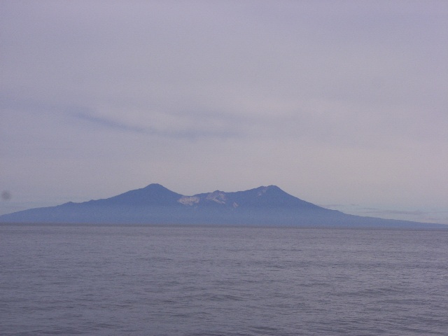 早朝、だれかの、「択捉/イトゥルップ島が見えているぞ!」と叫ぶ声で目が覚めた。私たちは、急いで甲板へとむかった。