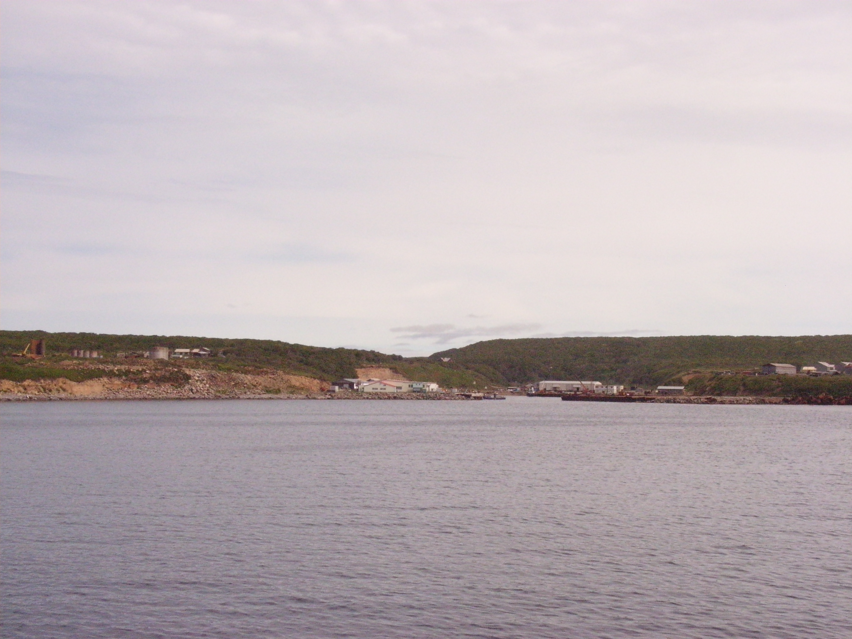 海岸沿いは海岸段丘が広がっている。紗那/クリリスクの集落は、私たちが停泊しているナヨカ/キトブィ湾からは見えず、さらに奥に存在している。日本時代には、湾に沿って漁業集落があった。現在は、漁業関連施設とおぼしき、見るからに新しい建物が点在している。