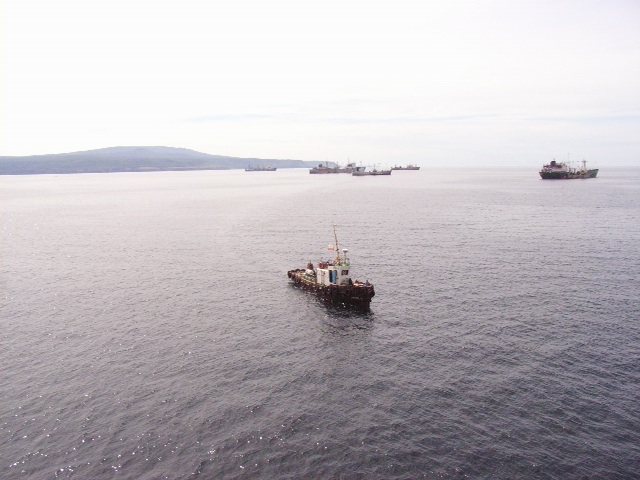 午後2時ごろ、日本時代からの、択捉/イトゥルップ島の主要都市、紗那/クリリスク沖合のナヨカ/キトブィ湾に船は碇をおろした。予定より二時間も早い。当初は、船長の許可を得られればもしかして短時間でも択捉島に上陸できるのでは…と期待したが、それは無理だったので、甲板上から島を観察することになった。