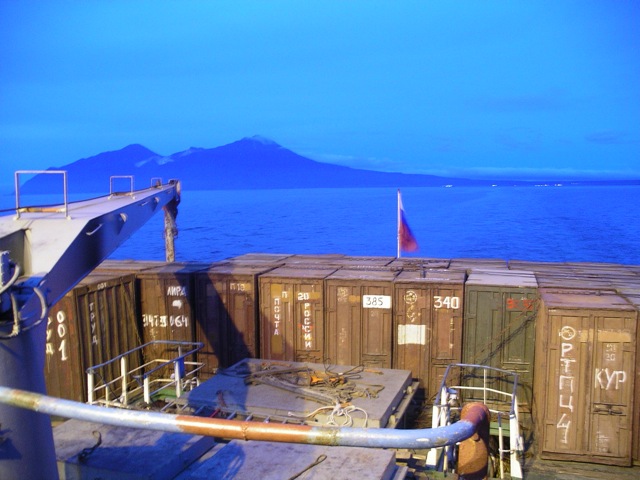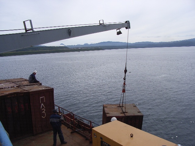 船と陸との貨物の受け渡しは、コンテナを使って行われている。樺太/サハリン本島から送られてくる荷物を島に降ろし、または島から送る荷物を積み込む。活発な経済活動を反映し、交易はかなり大規模のようで 大量の荷物を処理するのに大変時間がかかった。コンテナのなかには、ロシア郵政のものあった。郵便物もこの船で輸送されているのである。ちなみに、日本本土から択捉/イトゥルップ島あてに郵便を出すと、モスクワ経由で送達される。料金はヨーロッパ向けと同じで、あて先を「Russia」と書かなければ届かない。