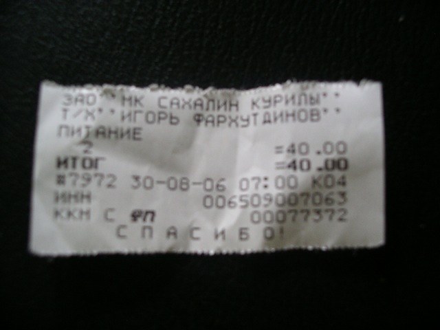 しかし、この船内食堂は、ソ連時代の勤労者食堂の性格を受け継いでいるようだ。というのも、この船の乗客のほとんどは、国後/クナシル島や択捉/イトゥルップ島の島民である。これらの島での生活は、樺太/サハリン本島に比べれば厳しい。この船の食堂の低料金は、それに対する一種の補助であるといえよう。「共産党や政府に不満さえ言わなければ、そこそこの生活を誰もが享受できる」という社会主義の評価できる側面をこうした形で体験することができたのは、私たちにとって大変貴重であった。独占状態であるがゆえに、船内食堂の料金が高い日本のフェリーとは大きく違う。