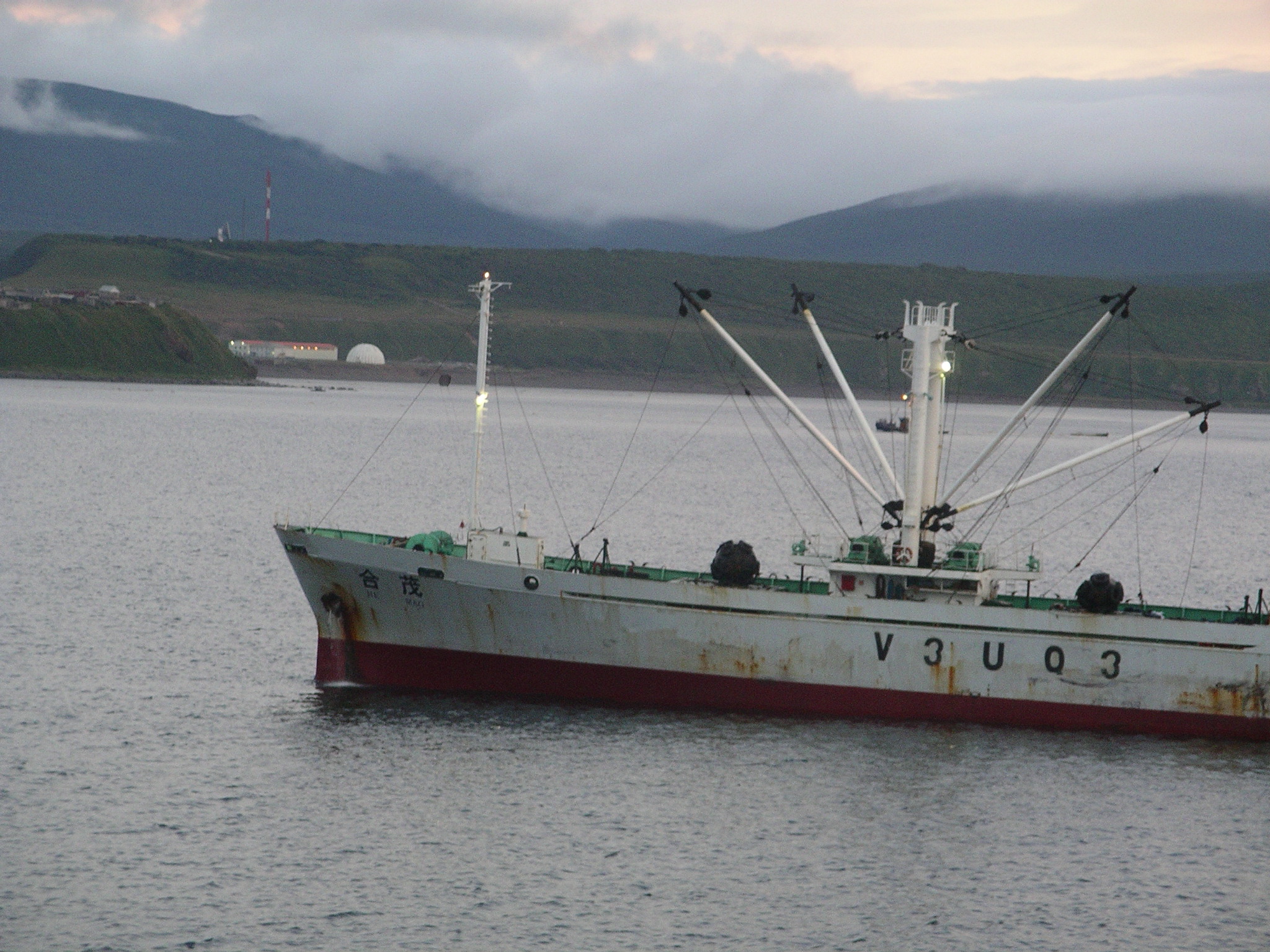 湾には、大型の漁船や漁船に必要な石油を積んだタンカーが何隻も停泊していた。漁業を中心としたこの島の経済活動は、かなり盛んなことがうかがえる。「合茂」と中国語で船名が書かれた漁船もおり、このナヨカ/キトブィ湾を漁業基地として使っているのかもしれない。こうした経済活動が、根室のすぐそばで、日本人の知らないあいだに行われていることには、改めて驚かされる。