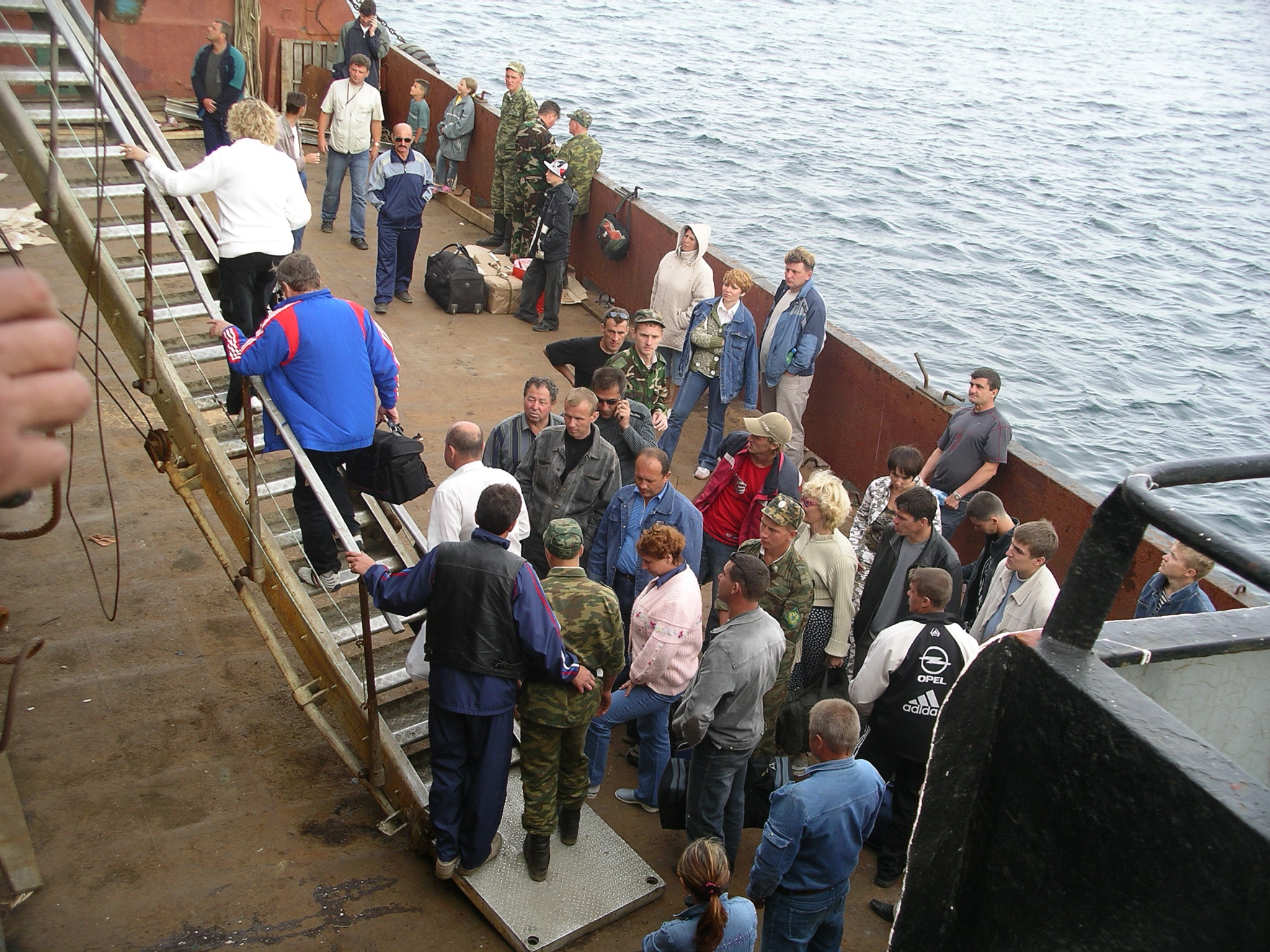 夕暮れになるころ、ようやく客扱いが始まった。紗那/クリリスクの港はこのフェリーが横付けするには小さすぎるので、乗客の乗り降りと貨物の受け渡しは艀を使って行われる。乗客の乗り降りには50分ほどの時間がかかり、乗る人が約50人、降りる人が約75人いた。樺太/サハリンで購入した製品とかばんを持って危なっかしい階段を下りるのは、慣れているはずの地元のロシア人もつらそうだった。