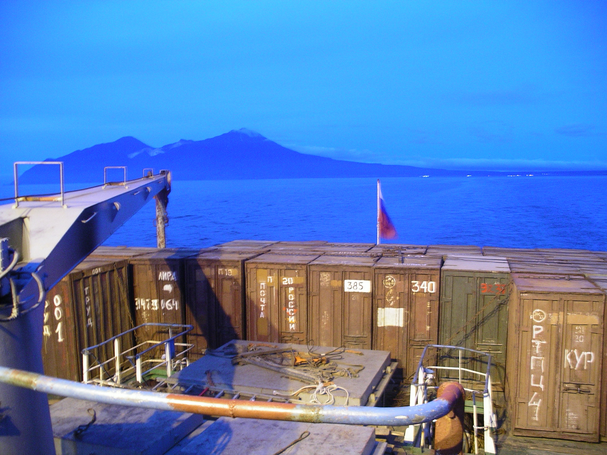 択捉/イトゥルップ島の観察を続けていると、時間がどんどん過ぎ、気がつけば何時間も甲板の上にいた。乗客の乗り降りと貨物の積み下ろし・積載も終わり、あたりが暗くなってくるころ、船はようやく国後/クナシル島に向けて出航した。