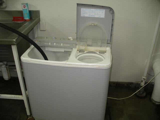 東芝製の洗濯機が、船内2階の洗濯室に備え付けられている。これはもともと、船内乗客用のシーツなどを洗濯する業務用なのだが、乗客の個人的な衣類の洗濯にも使わせてくれた。
