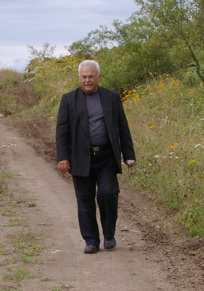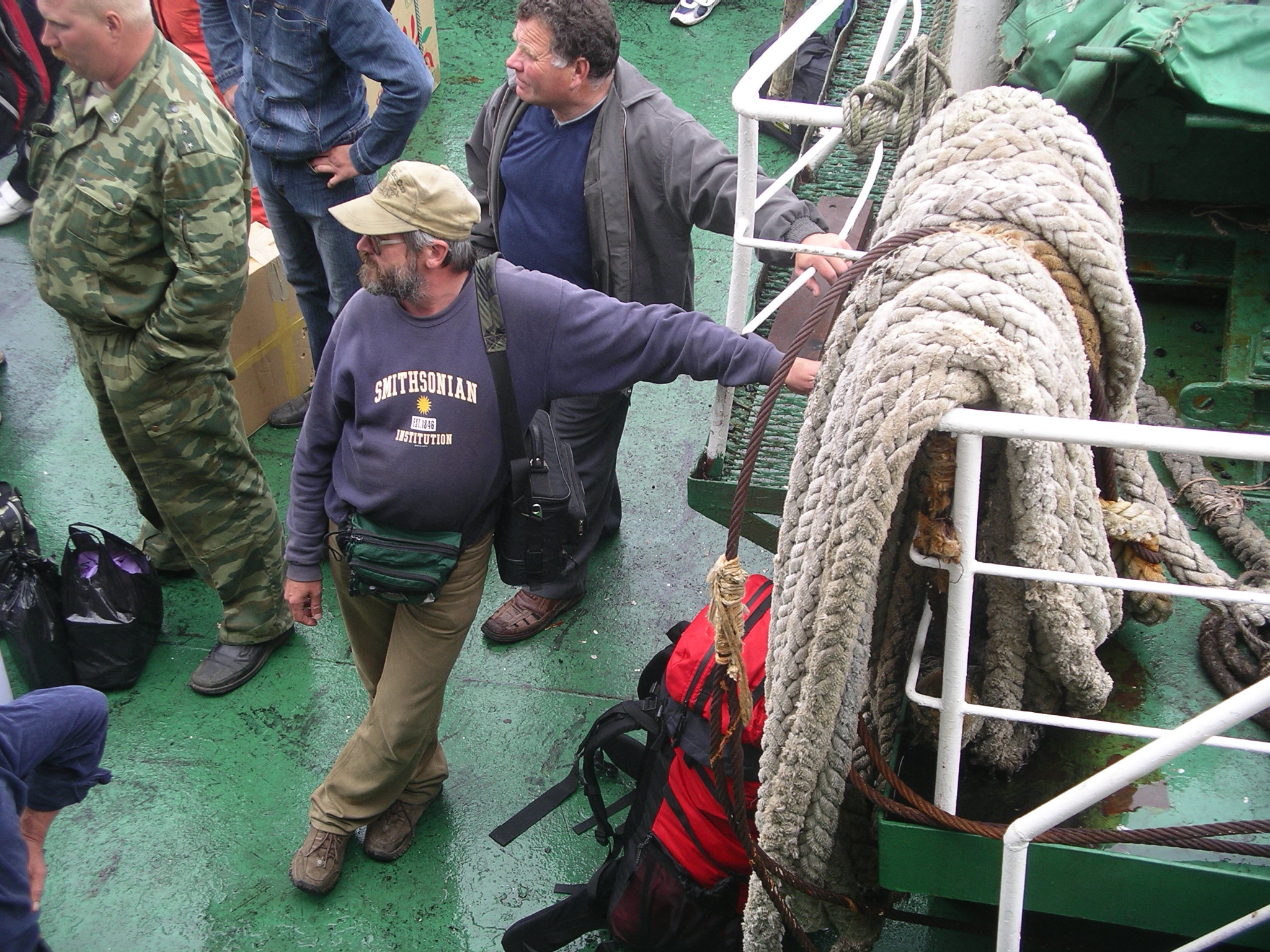 私たちは、艀にいる乗客の中に、サハリン州郷土博物館のサマーリン部長(右写真)をみつけた。サマーリン部長は、樺太/サハリンや千島/クリルの日本時代の遺構を専門に調査・研究なさっている方である。もともと、私たちは、サマーリン部長とともに国後/クナシル島を訪れる予定であった。だが、その前に、柏原/セベロクリリスク方面へ調査に赴いておられたサマーリン部長は、、現地の交通事情がわるいため、豊原/ユジノサハリンスクに予定通り戻れなかった。そこで、柏原/セベロクリリスクから貨物船をつかまえて古釜布/ユジノクリリスクに到着、ここから樺太/サハリンへ戻るため、私たちの船に乗りこんできたのである。