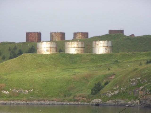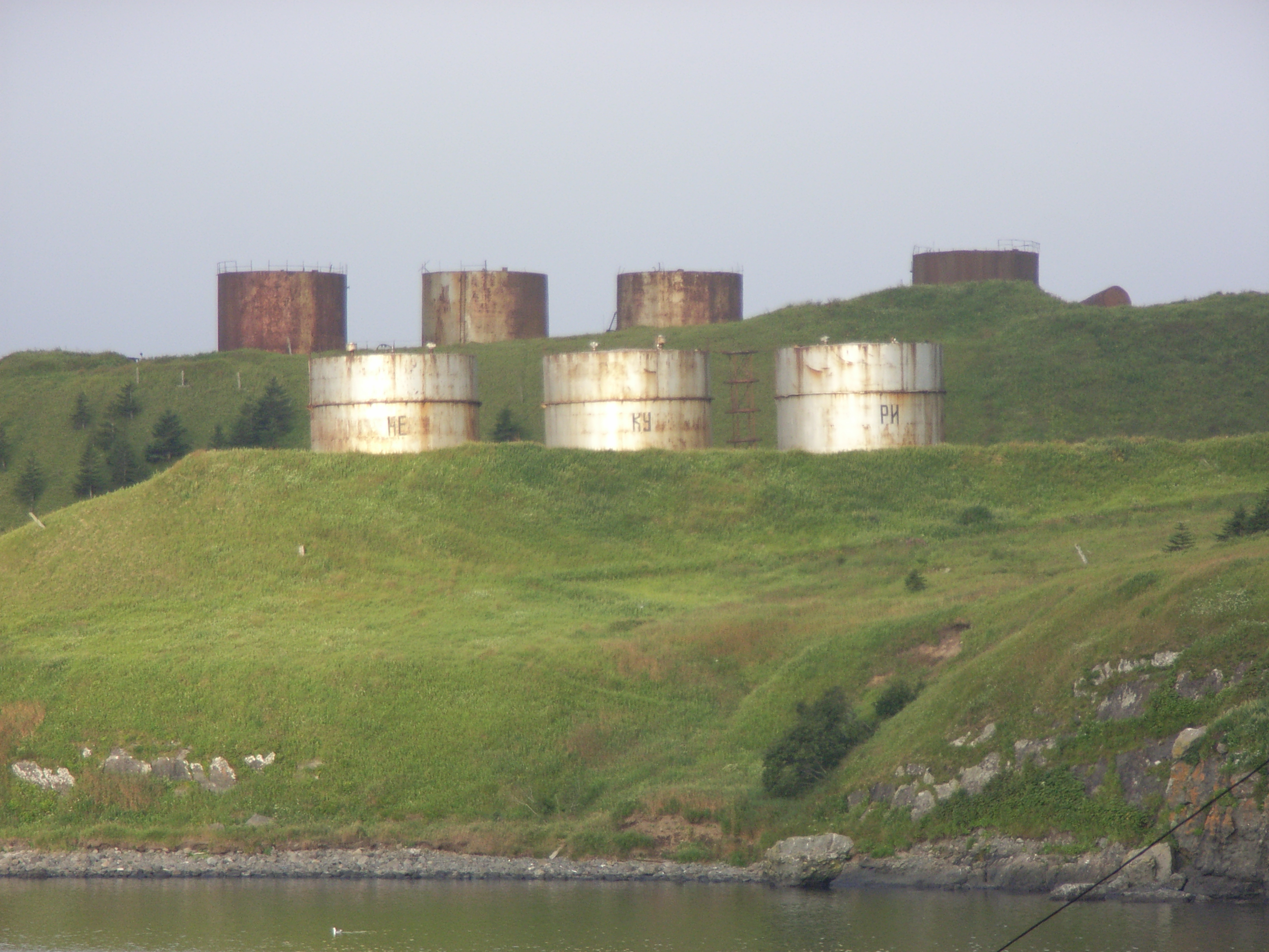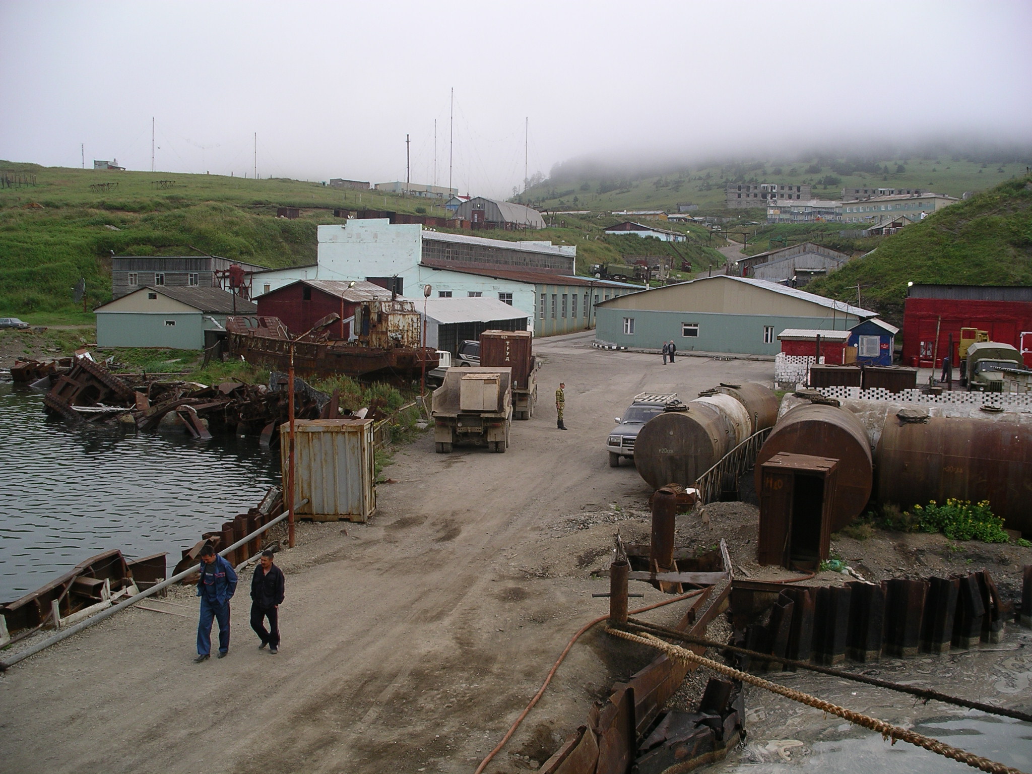 陸地を見回してみると、軍用とおぼしきトラックや、戦勝記念に飾ってあると思われる迷彩色の戦車が見えた。また、明るい色で塗装された2階建ての建物と、工場のような建物は、いまやロシアの極東地域有数の大手水産加工会社となった、ギデロストロイ社の施設である。ギデロストロイ社が、択捉/イトゥルップ島を拠点としつつ、北方諸島全体に経営の手を広げつつあることがわかる。