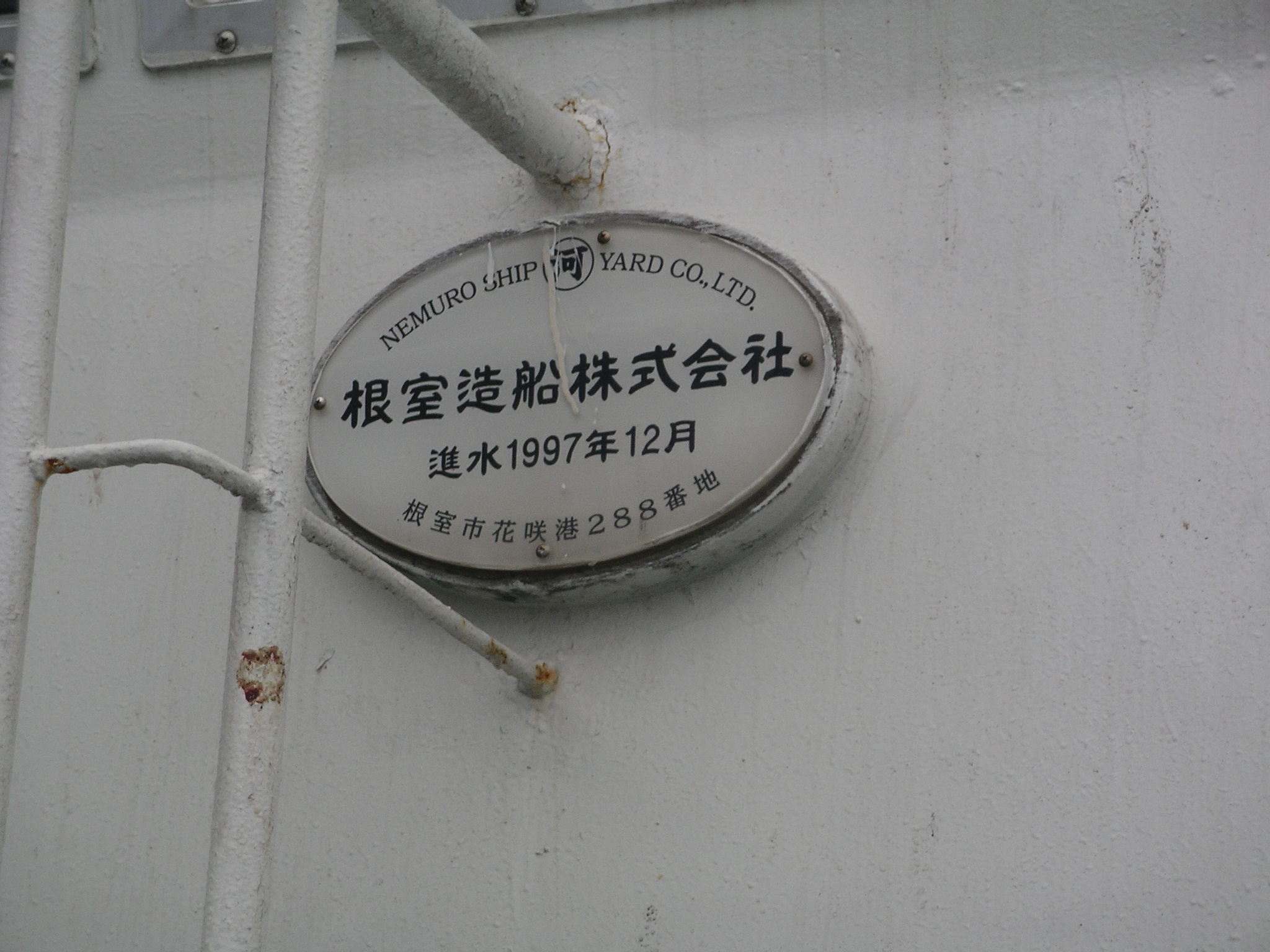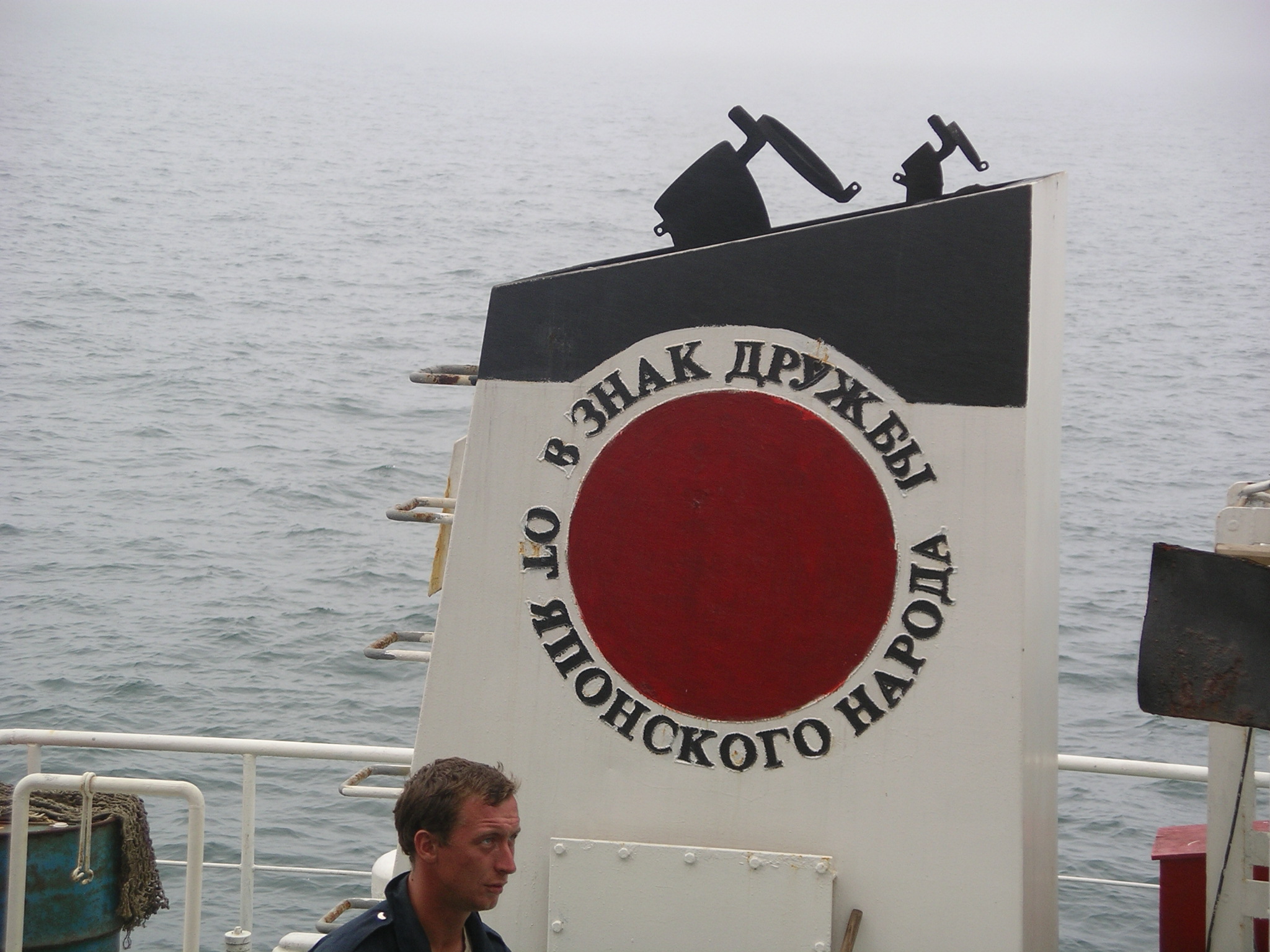 艀の船名は「希望丸」、1997年根室造船株式会社製である。煙突には、大きな赤い日の丸と、日本国民の友好のしるしというロシア語が書かれている。かの有名な鈴木宗男氏の尽力により日本から寄付されたものだ。北海道の中小造船会社が製造を担当しているのは、鈴木宗男氏が自らの出身地である北海道、とくに道東の経済を振興させようとしていたためであろう。