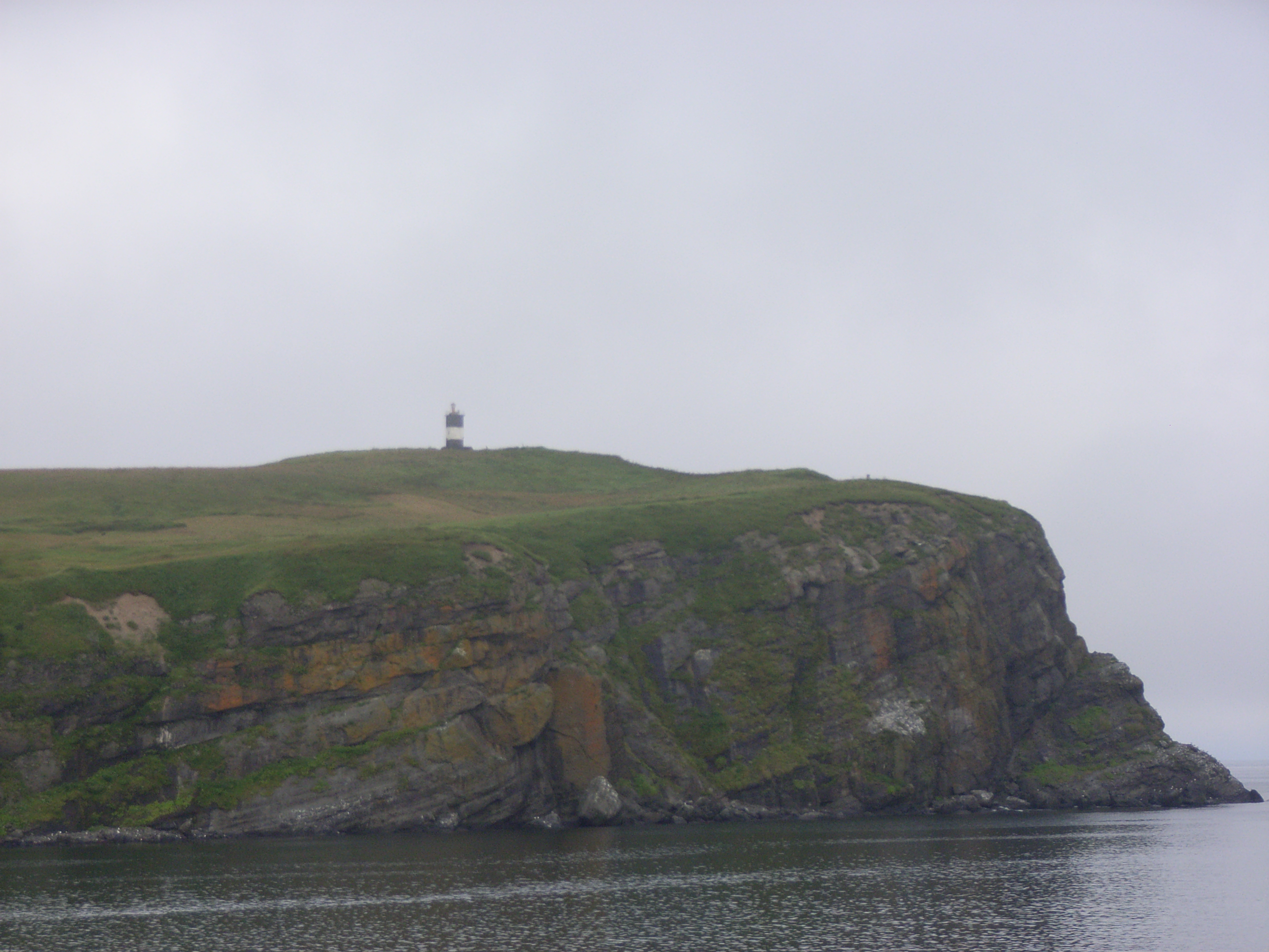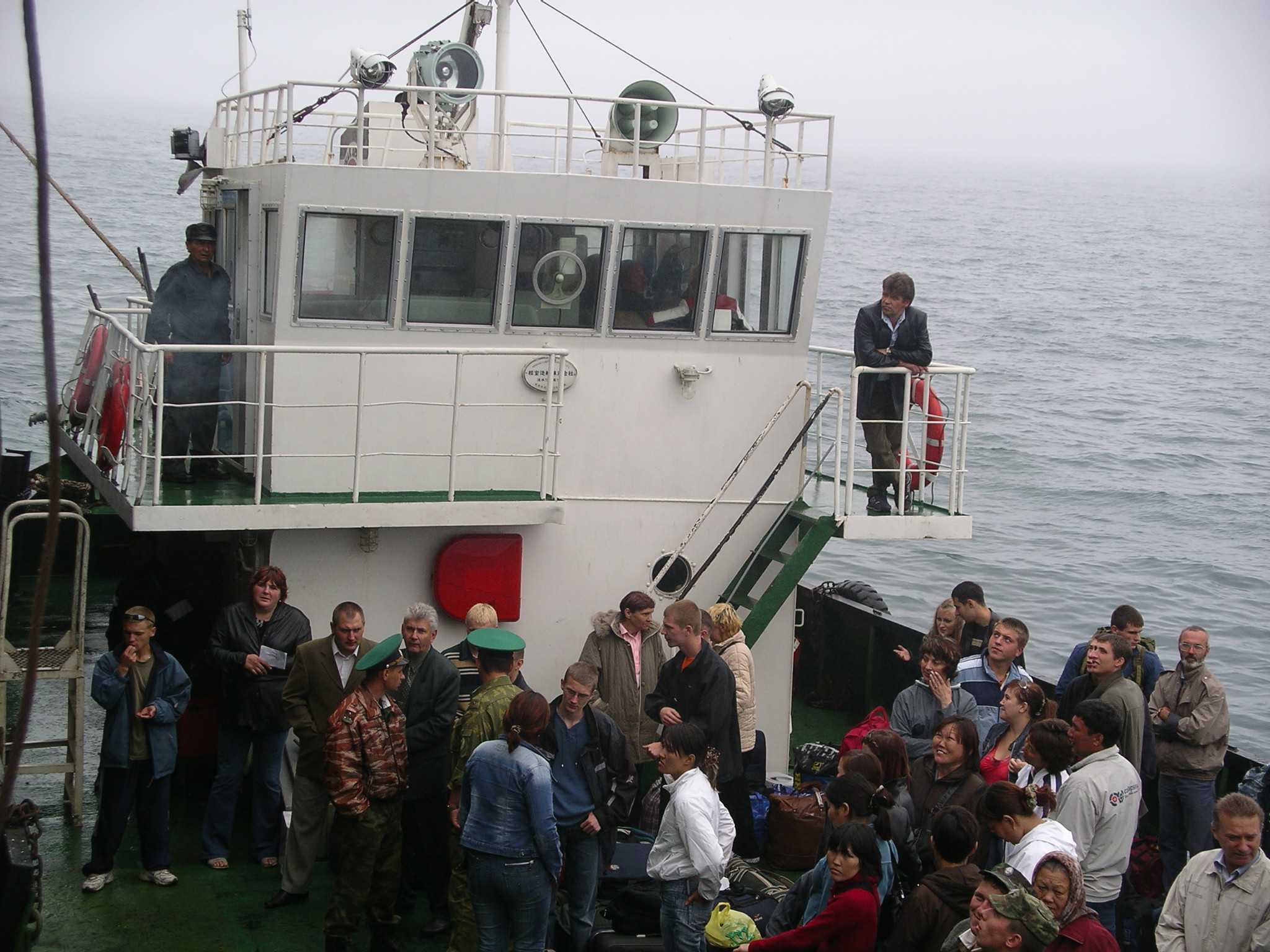 私たちは、色丹/シコタン島の様子を見るため甲板へ出た。朝霧がかかっていてどんよりした天気で、とても肌寒い。緯度は樺太/サハリン島よりも南に位置しているはずなのに、気温は15度を下回るくらいであろうか。樺太/サハリン島北部のオハといい勝負なくらいの寒さだ。