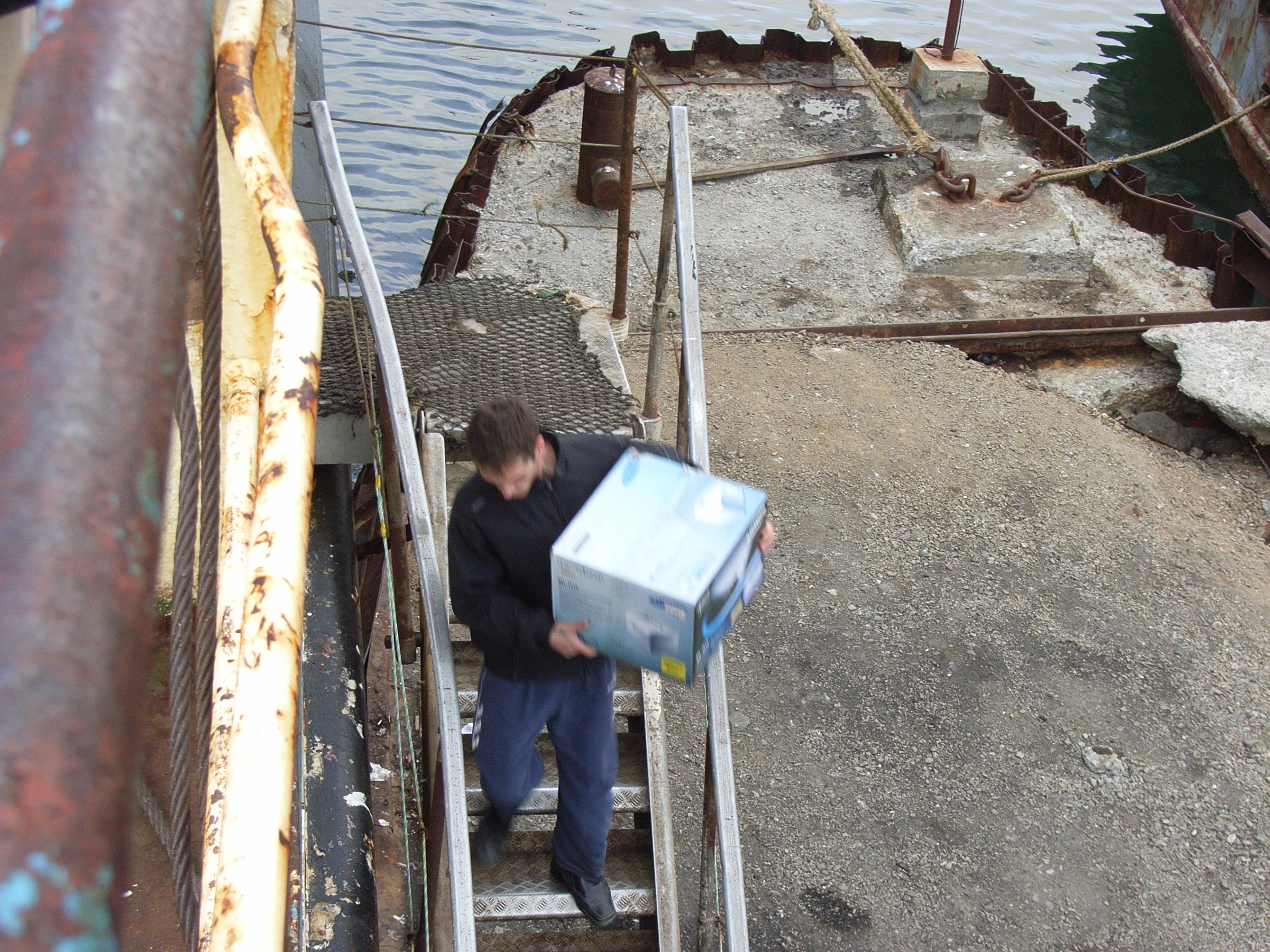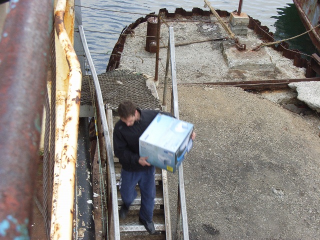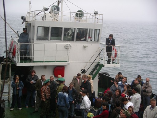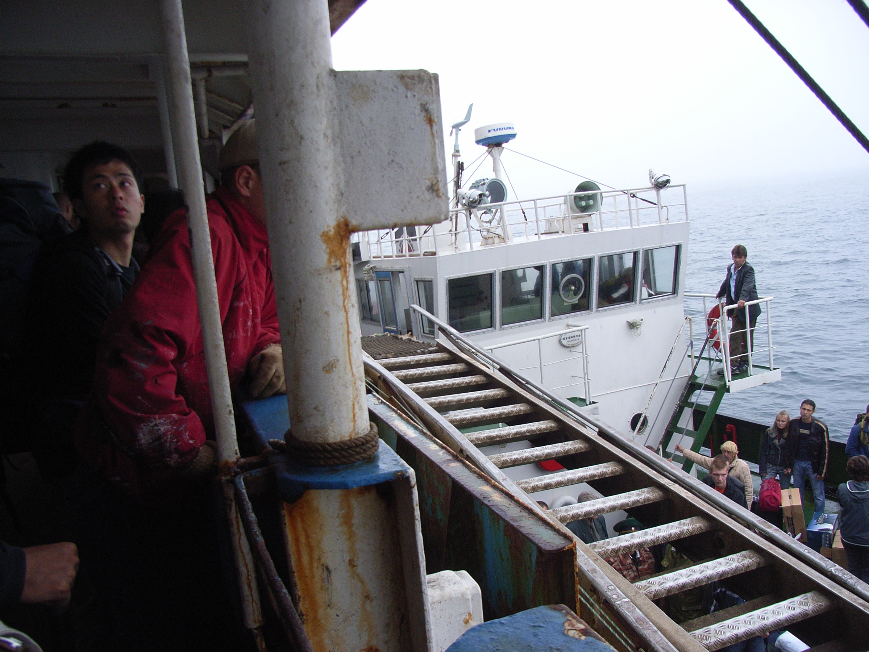 乗船が済んで、午後3時半すぎ、下船客が階段を伝って艀へ乗り換えはじめた。パスポートと乗船券、そして通行許可証のチェックをすませた私たちも、重い荷物を持ち、階段に踏み出した。階段といっても、手すりを付けたはしごと言った方が適切なしろもので、足場が悪く、踏み外したら危険である。しかも波で階段がよく揺れる。高齢者の乗客にとってはさぞ大変だろう。ここでも、乗客のなかに樺太/サハリン島で購入してきたのであろうテレビなど大型の家電製品を抱えている人もおり、これまた降りるのが大変そうだ。
