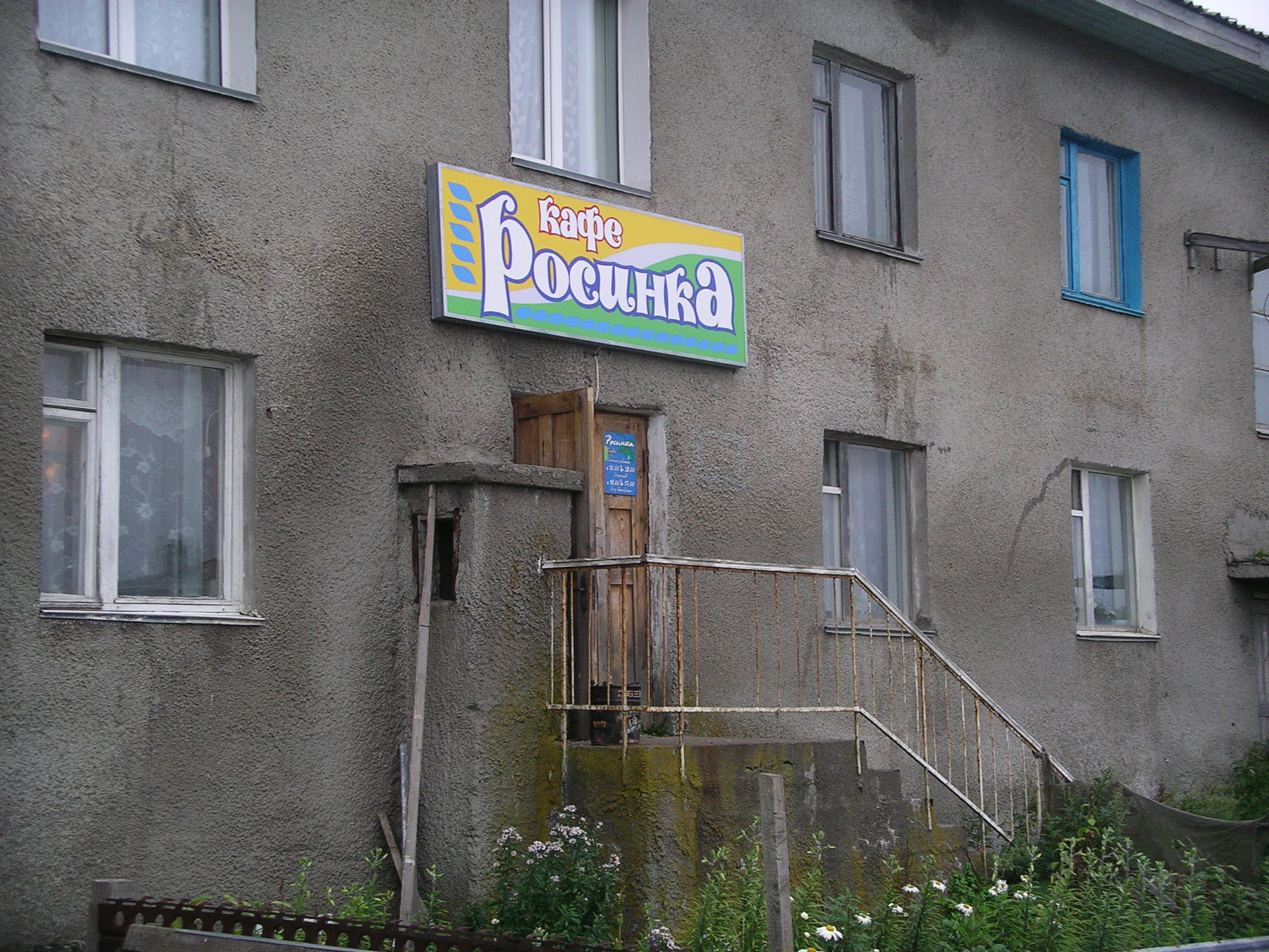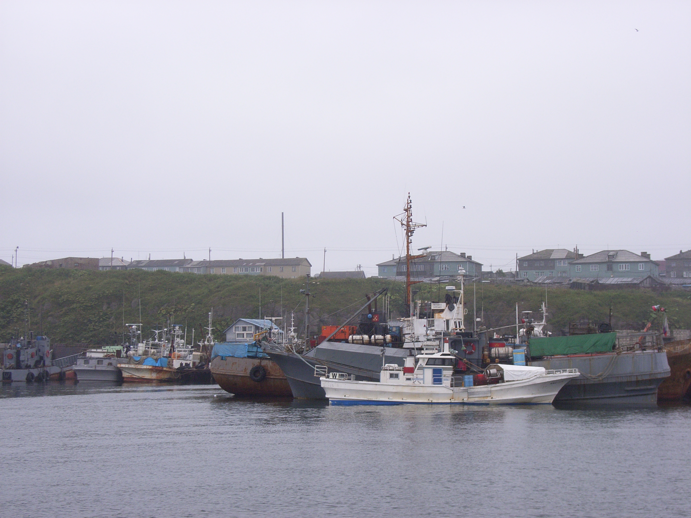 港の周囲はかなり起伏のある丘陵地になっていて、谷筋に沿うように斜古丹/マロクリリスクの街が広がっている。崖の上の内陸側に街があるので、思うようには街の全体を見渡せないが、建物がいくつも建っているのはわかる。ソ連時代に建てられたと思われる、全般的に地味なグレー系の色の2階建ての古いアパートが目立つ。樺太/サハリン島全土でしばしばお目にかかった、5階建て程度の社会主義住宅は見られない。霧がかった曇り空もあいまって、まるでモノクロ写真を見ているような色合いだった。日本が領有権を主張している島であることが嘘のように、異国情緒が漂う景観である。