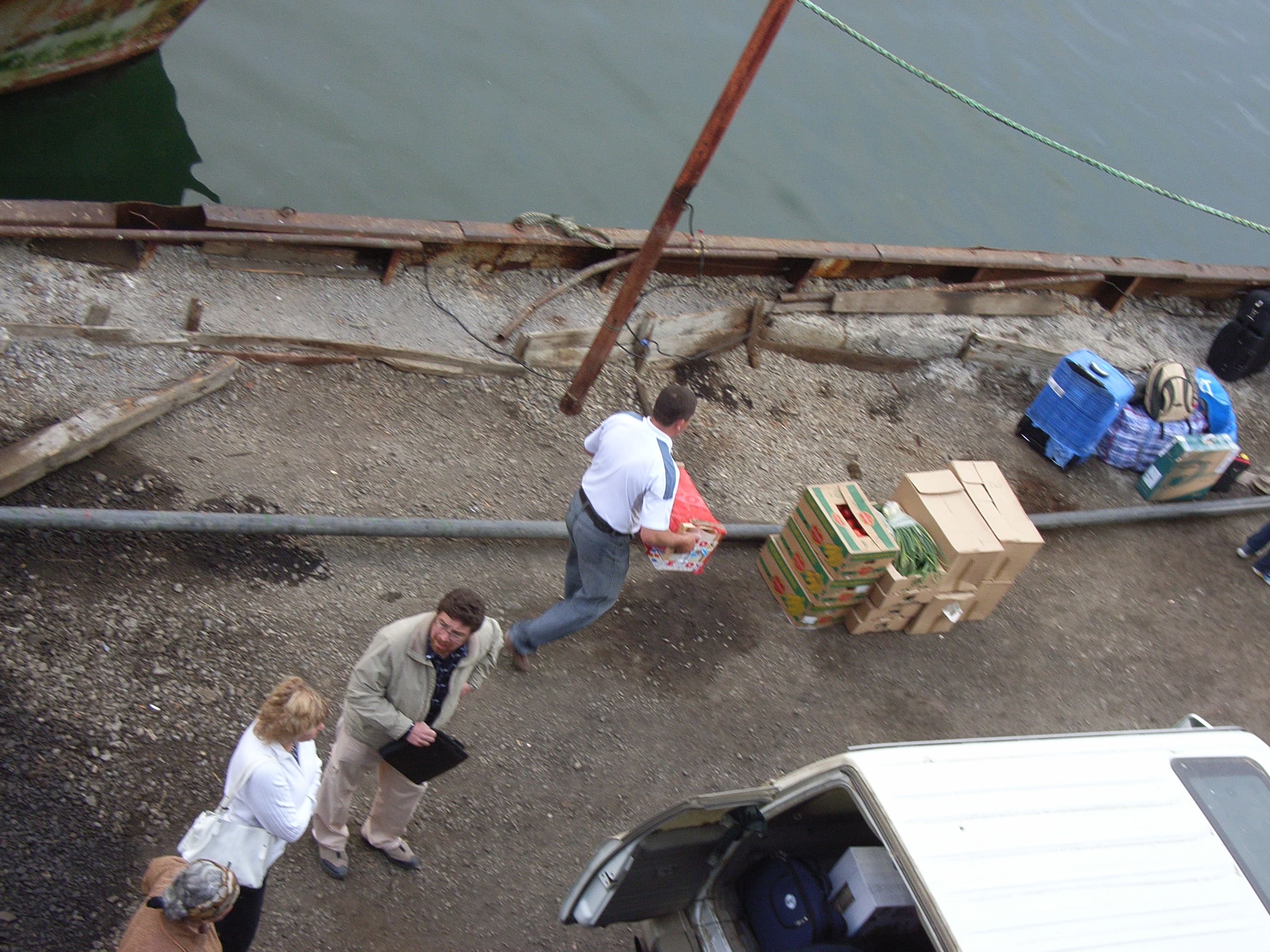 これらの荷物を抱えた乗客が降り立った桟橋には、出迎えと思われる車が何台もいた。その近辺には軍服を着た人が数人監視についていた。