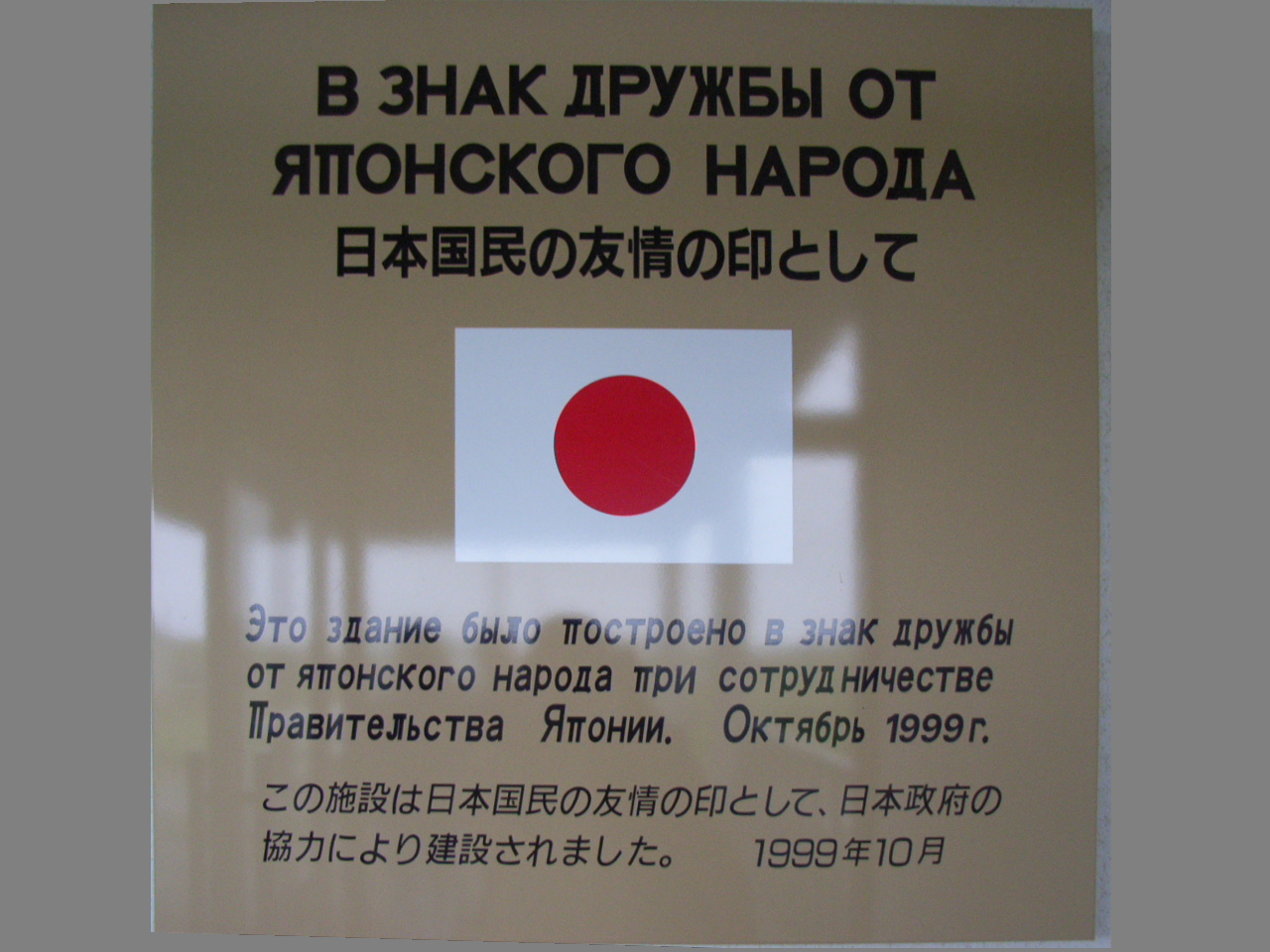 簡単に撤去できない恒久な建物を日本の援助で建設することに関して日本政府が難色を示したため、あえて建設や撤去が比較的簡単にできるプレハブ製にしてあるという。入り口には、この建物が日本政府の協力によってつくられたことをうたうプレートが目に付いた。日本の国旗が描かれており、その下に「この施設は日本国民の友情の印として、日本政府の協力により建設されました」と、日本語とロシア語で表記されていた。