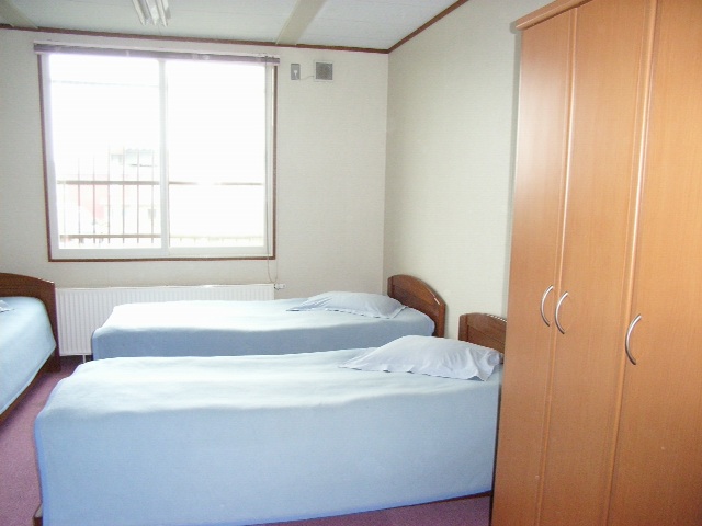 まだ築7年ということもあり、プレハブといえども周囲の建物と比べればきれいで立派に見える。サイズも大きく、5m×4mくらいで4人ほど入る部屋や、2人用の部屋があわせて10室以上もあるほか食堂などの設備がある。プレハブといっても、日本の工事現場で作業員が使うようなものとはまるでスケールが違う。クリーム色の壁にえんじ色の平らな屋根という華やかな配色が、周りのくすんだ社会主義時代の建物のなかに、ひときわ引き立っている。工費は4億円あまりだそうだが、その程度の価値はたしかにあるだろう。