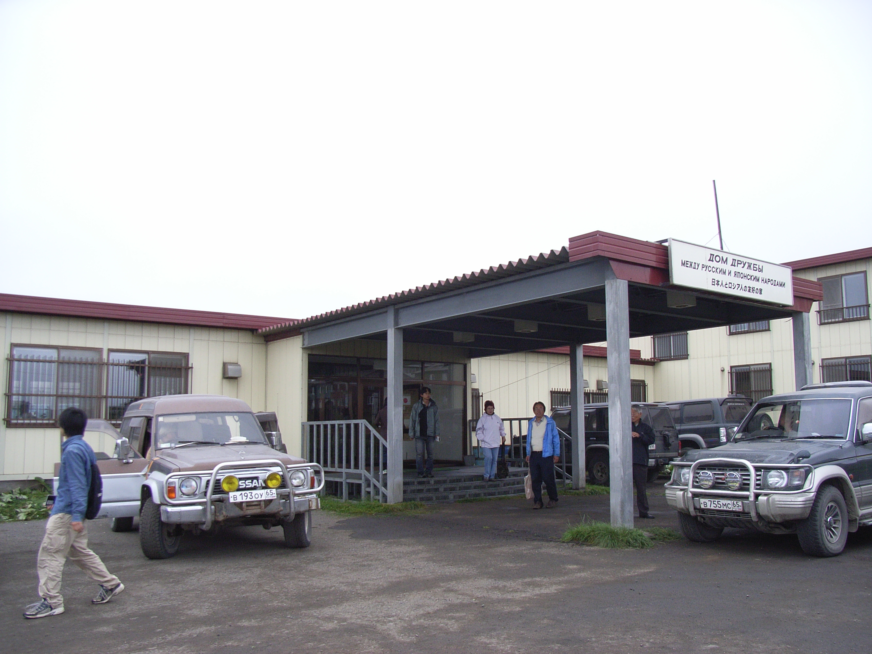 艀から、制服を着た人が数人監視している桟橋に上陸すると、私たちは迎えにきてくれていたワゴン車にすぐさま分乗した。高台の下にある海沿いの道をほんの数分走ると、私たちが国後/クナシル島で宿泊する「日本人とロシア人の友好の家」、通称ムネオハウスに到着した。