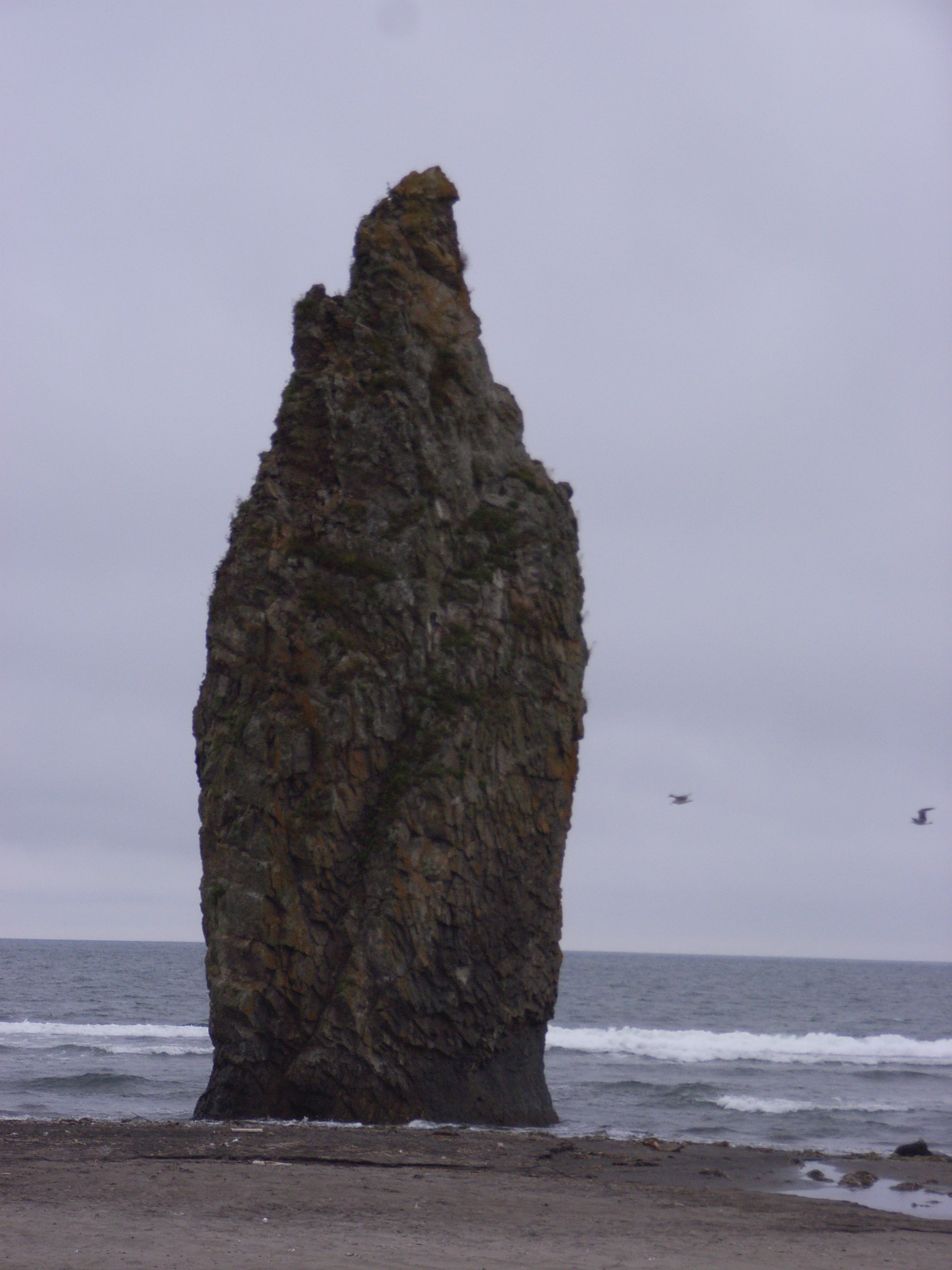 古釜布/ユジノクリリスクの郊外は、平地が比較的多い。海沿いを走る車の車窓からは荒涼とした草原が見え、所々にくず鉄が放置されていた。10分程度車を走らせると、蝋燭岩(ろうそくいわ)という岩に到着した。砂浜の海岸にぽつりと聳え立っている不思議な岩である。名前のとおり、蝋燭のような形をしている。地形図によると、高さ31mという、とても高い岩だ。周囲には海鳥がたくさんいた。