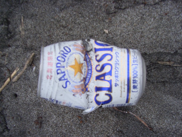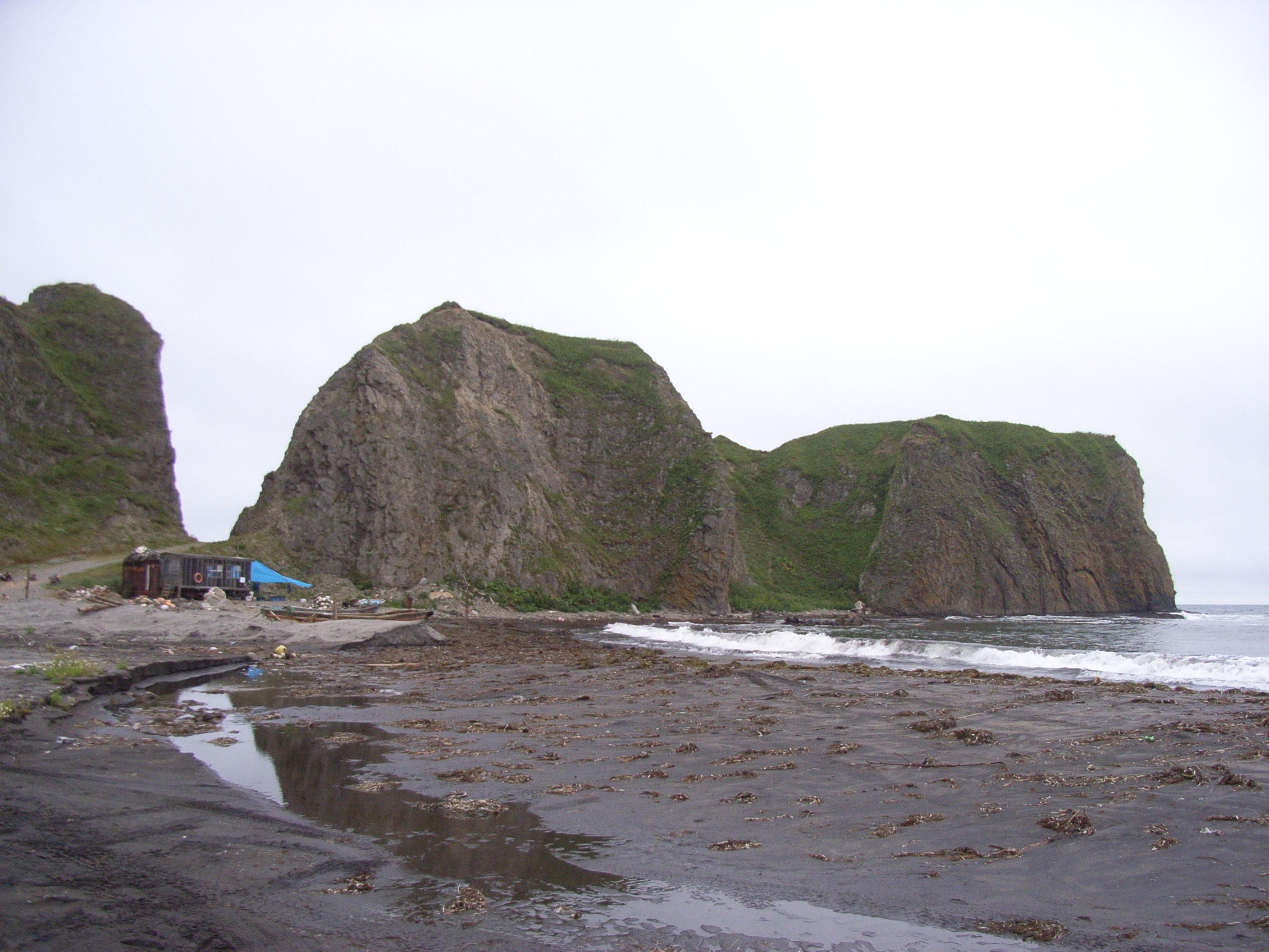 今日が8月30日であることを疑いたくなってしまうような荒涼として寒々しい海岸沿いを暫く散歩した。海岸には、日本製カップヌードルの容器の破片や日本製ビールの空き缶など、懐かしい漂流物がたまに見受けられる。私たちは国後/クナシル島まで、稚内→樺太/サハリン島→国後/クナシル島と、途方もない手間と時間をかけて来た。とはいえ、国後/クナシル島は北海道の野付半島まで、最も近いところで20km足らずである。ロシアの実効支配地である国後/クナシル島と北海道本土の間に、日本人が通過することが大変困難な国境があるわけだが、漂流物はいとも簡単に国境を越えてやってくる。国後/クナシル島が日本本土から「近くて遠い地」であることを実感させられた。