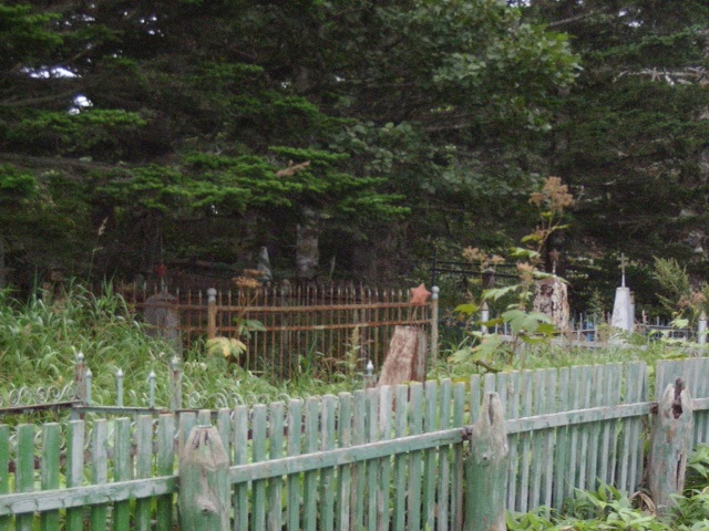 気候がよくなった4月のイースターのころ、クリル日本センターの人がたまに来て掃除をしてくださっているそうだが、これに日本政府からの援助はでていないという。日本人墓地のとなりにあるソ連人の墓地も、草が生い茂っている。転出してしまうと、墓地を管理する人がいなくなるのだそうだ。ソ連人の墓碑は、てっぺんに共産主義のシンボルの赤い星印がついている。ソ連崩壊後に立てられたと思しきロシア人の墓碑にはロシア正教の十字架がてっぺんについている。その近くには、ロシア正教の礼拝所があった。