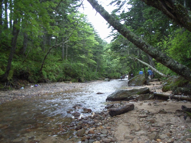 墓地の視察を終え、私たちは、島の手付かずの自然の一端を知るため、砂利道を車で移動して羅臼/メンデレーフ山の麓を流れる精進/レスナヤ川に行った。足のすねぐらいまで水がある川を100mぐらい歩いて遡上すると、小さな滝があった。川の水は大変冷たい。また、水には火山性の含有物が多いようで、川の石はやや茶色っぽく変色していた。