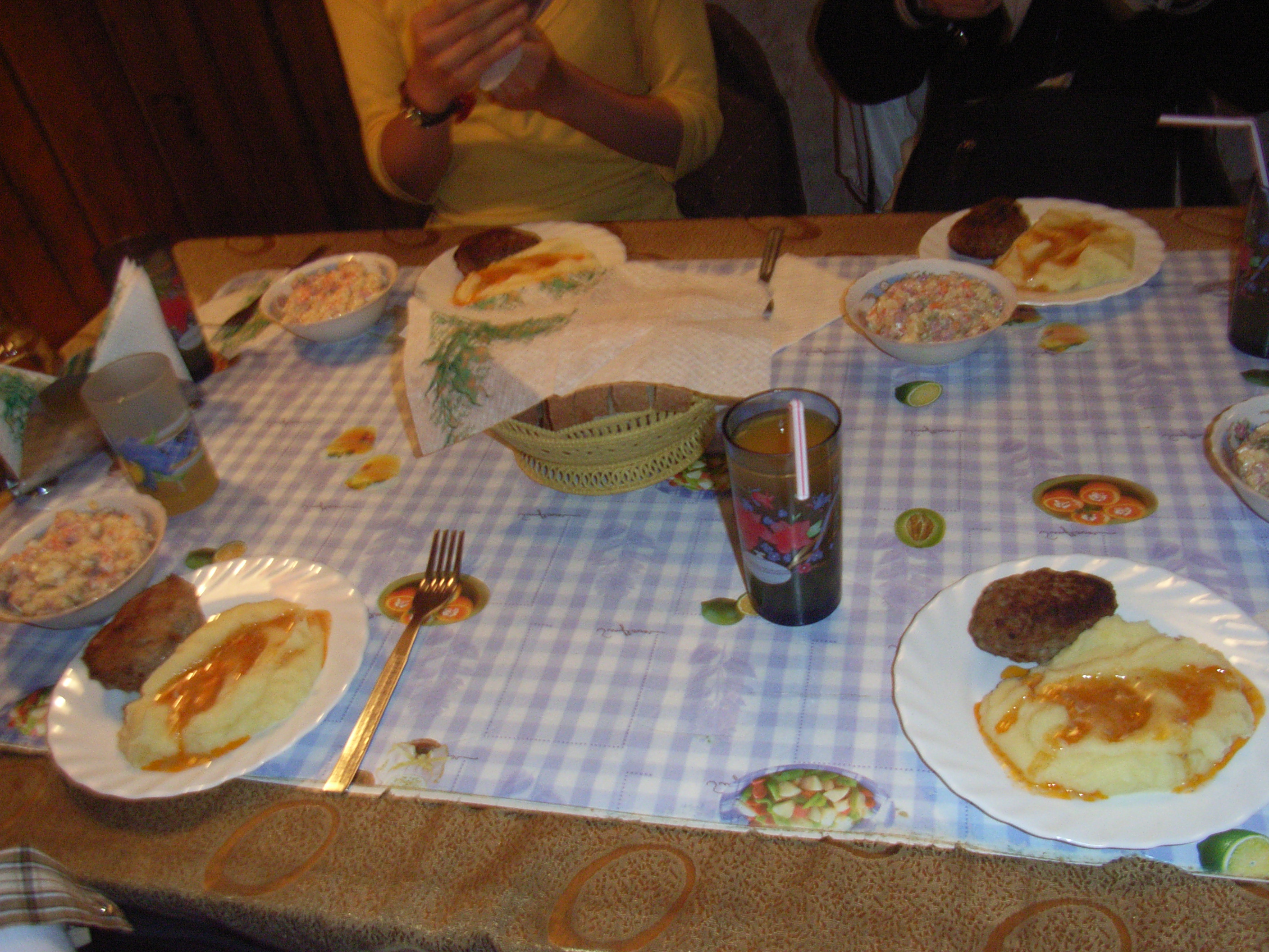 午後7時、夕飯をとりに、あらかじめ予約を入れていた近くの20席程度のレストラン「ロシンカ」に向かった。これまで巡検中に何度か入ったような、雰囲気重視で値段のかさむバーとは違って、手ごろなレストランである。メニューは、ジュースにパン、コーヒーまたは紅茶、ポテトサラダ、ハンバーグ、じゃがいもと、デザートにクレープの生地にメープルシロップのようなシロップがかかったものである。味も私たちの口にあいとてもおいしい。