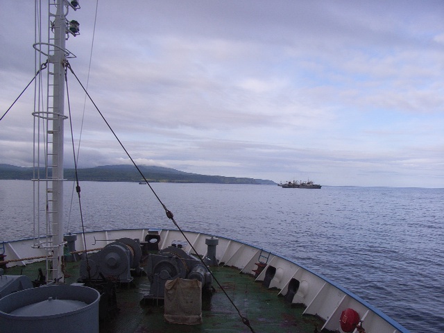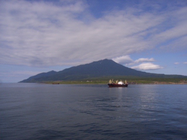 択捉/イトゥルップ島の山々は雲がかり、行きの時のように山々全体を見渡すことはできない。昨日、国後/クナシルから色丹/シコタンへ行く途中ではイルカやエトピリカ(鳥類)を見ることができたが、今日は1,2羽の海鳥が見えるのみである。