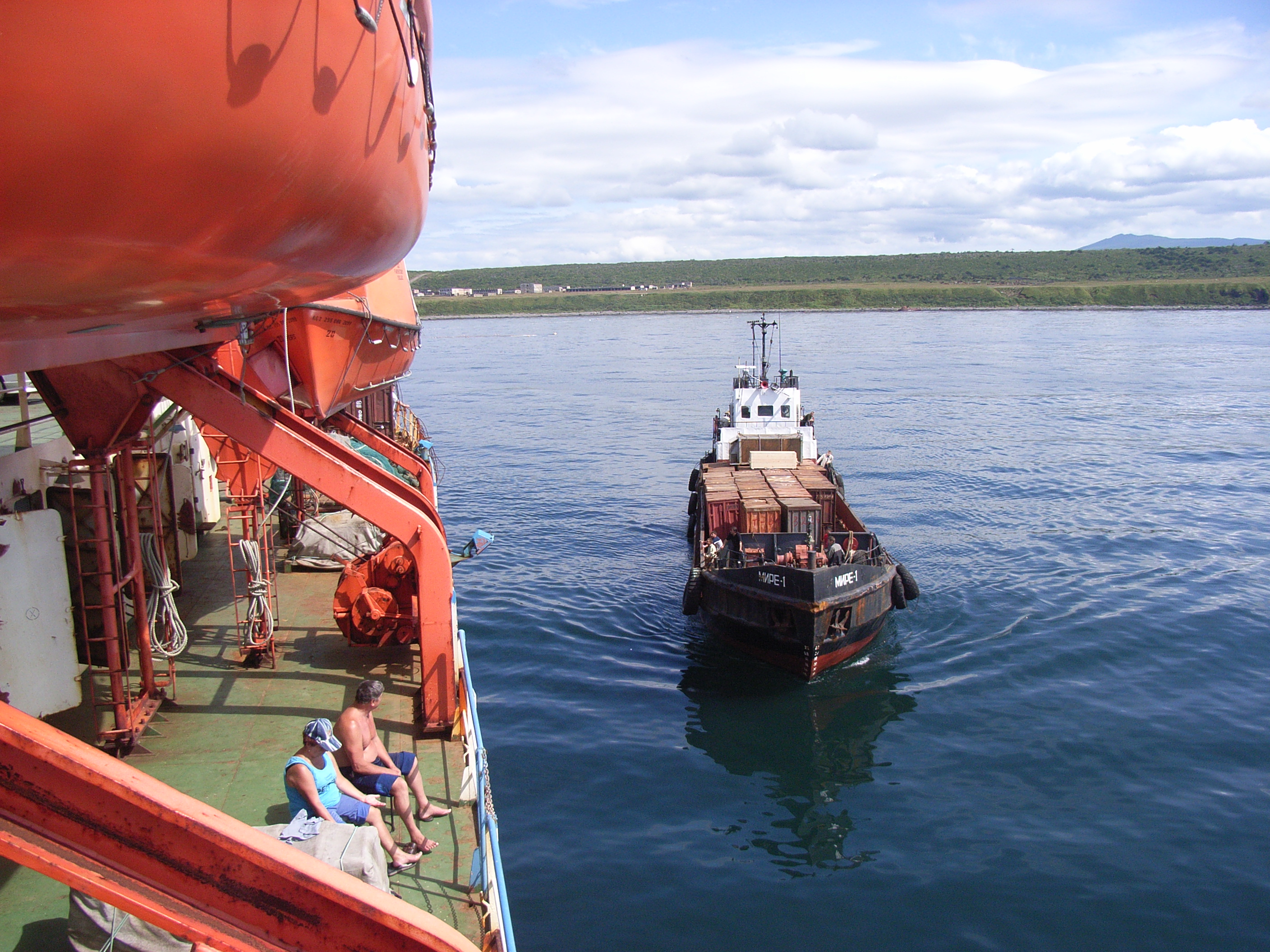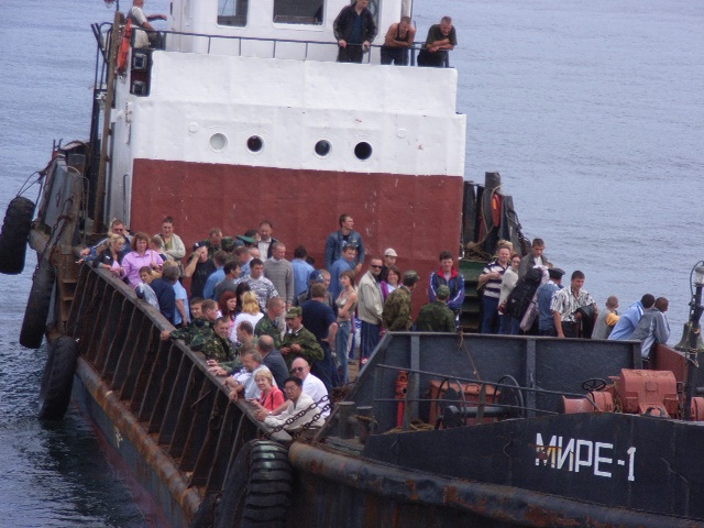 午後12時半に択捉/イトゥルップ島へ下船する人のために、海上で艀がこの船に隣接し、両船を結ぶ梯子が渡された。