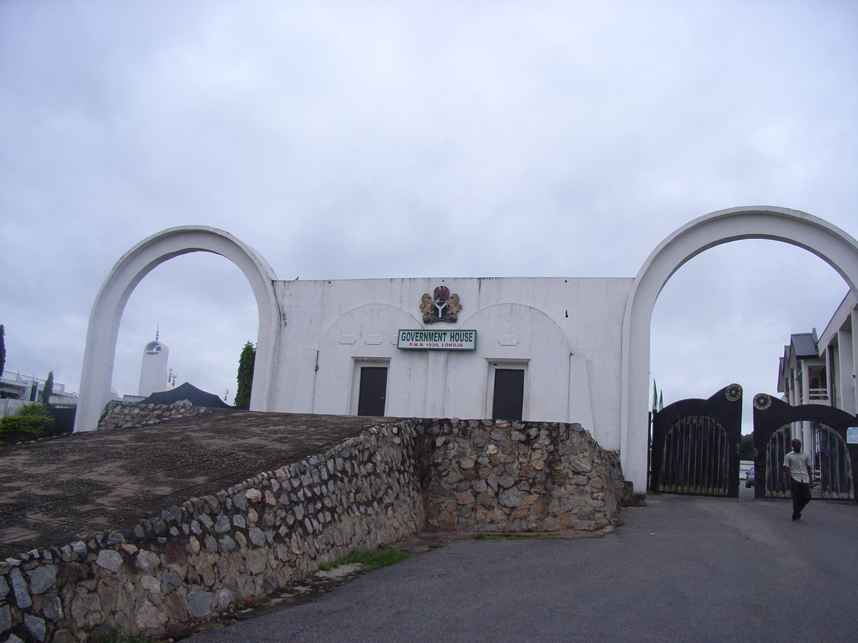 門は、スロープ状の形をした石段とその上に2つのドア、ナイジェリアの紋章を中央に置き、左右にアーチ型をした車輌が通行できるゲートを配した造りで、統治機構として威厳がある。Government Houseは正面からの見学と写真撮影のみにとどまった。