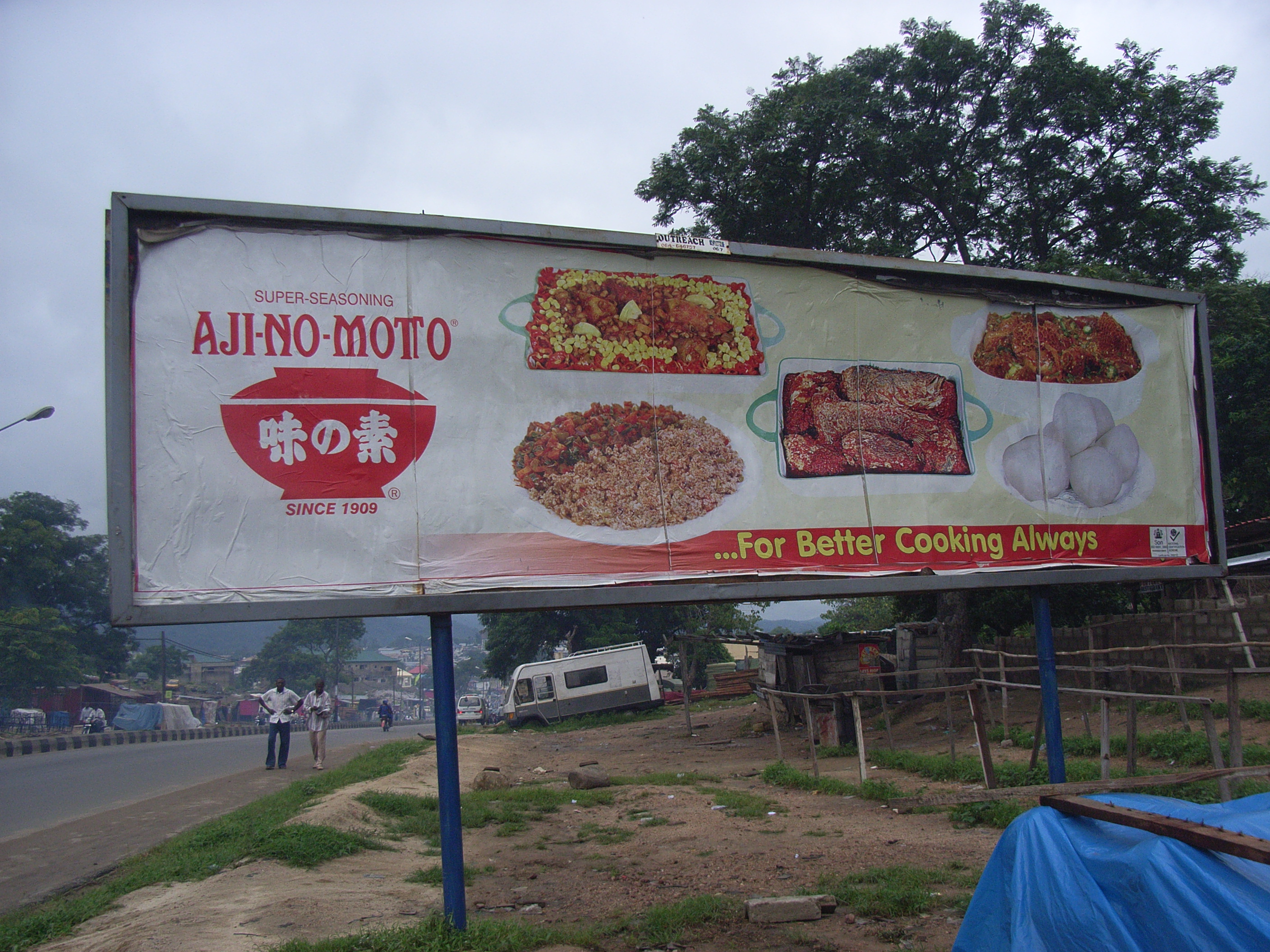 さらに車を進めると、ロコジャ市内を離れる直前に、味の素の現地法人West Africa Seasoningの、道沿いにある大きな広告の野立看板を見つけた。看板には、おいしそうな現地の料理の写真と、”SUPER SEASONING AJI-NO-MOTOという文字の下に、赤いどんぶりの形の中に「味の素」と日本語で書いた、かつて日本でも使っていた味の素のロゴが入っている。ナイジェリアの人でも、漢字を使っていることから、アジア企業の製品であることはわかるだろう。下にはSINCE1909と書いてあり、製品の歴史の長さで権威付けて、現地伝統の料理も、味の素を使えばこんなに美味しくなる、と訴えていた。