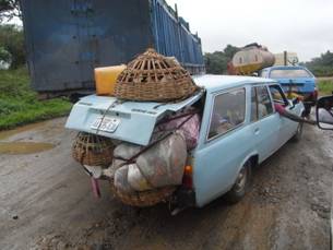 ロコジャからの長いドライブも、カラバルまで直線距離で、いよいよ100km強まで近づいた。日も段々暮れてきたと同時に、襲われないかという緊張感も増してきた。この辺りは、外国人がしばしば襲われる石油生産拠点、ポート・ハーコートを中心とするニジェール川デルタの影響圏にある。私たちは、さすがにポート・ハーコート自体の訪問は避けたが、ゲリラがここまで侵出していないという保証はない。ゲリラは、草むらに隠れていて、突然道路に飛び出してくるのだという。こうした事態に備え、私たちを銃を持った武装警官2名が護衛している。いざとなれば、この警官が頼りである。