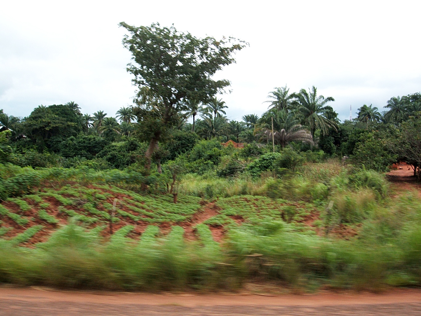 12時20分、私たちはオボロ(Obolo)という街に着いた。この頃になるとまわりの景色がロコジャにいた頃とは明らかに変わってくる。植生に関してはヤシの木のような熱帯性の木が増えてきた。南下するに連れて、サバンナ気候から熱帯性気候へとシフトしてきたということだ。農法の変化も見られ、複数の種類の作物を同じ場所に植える間作が目立つようになった。間作はアフリカの伝統的な農法で、生産性には限界がある。だが、自然の循環に依存し、地力の低下を防いだり、天候のリスクを回避できたりすることから、古くから採られてきた合理的な農法である。いわゆる「緑の革命」 は、この伝統農法がもつ合理性を否定し、単一作物栽培と自然の循環を断ち切った化学肥料導入をはかるという特色を有する。