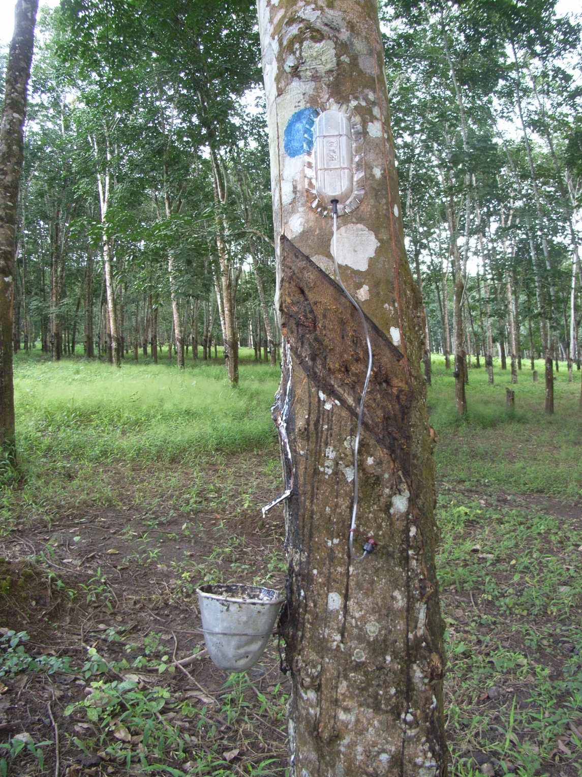 腰くらいの高さの所に据えつけられている小さな受け皿にゴムの樹液が流れ込む仕組みになっている。木の根元に、樹液が垂れて流れ。
