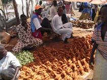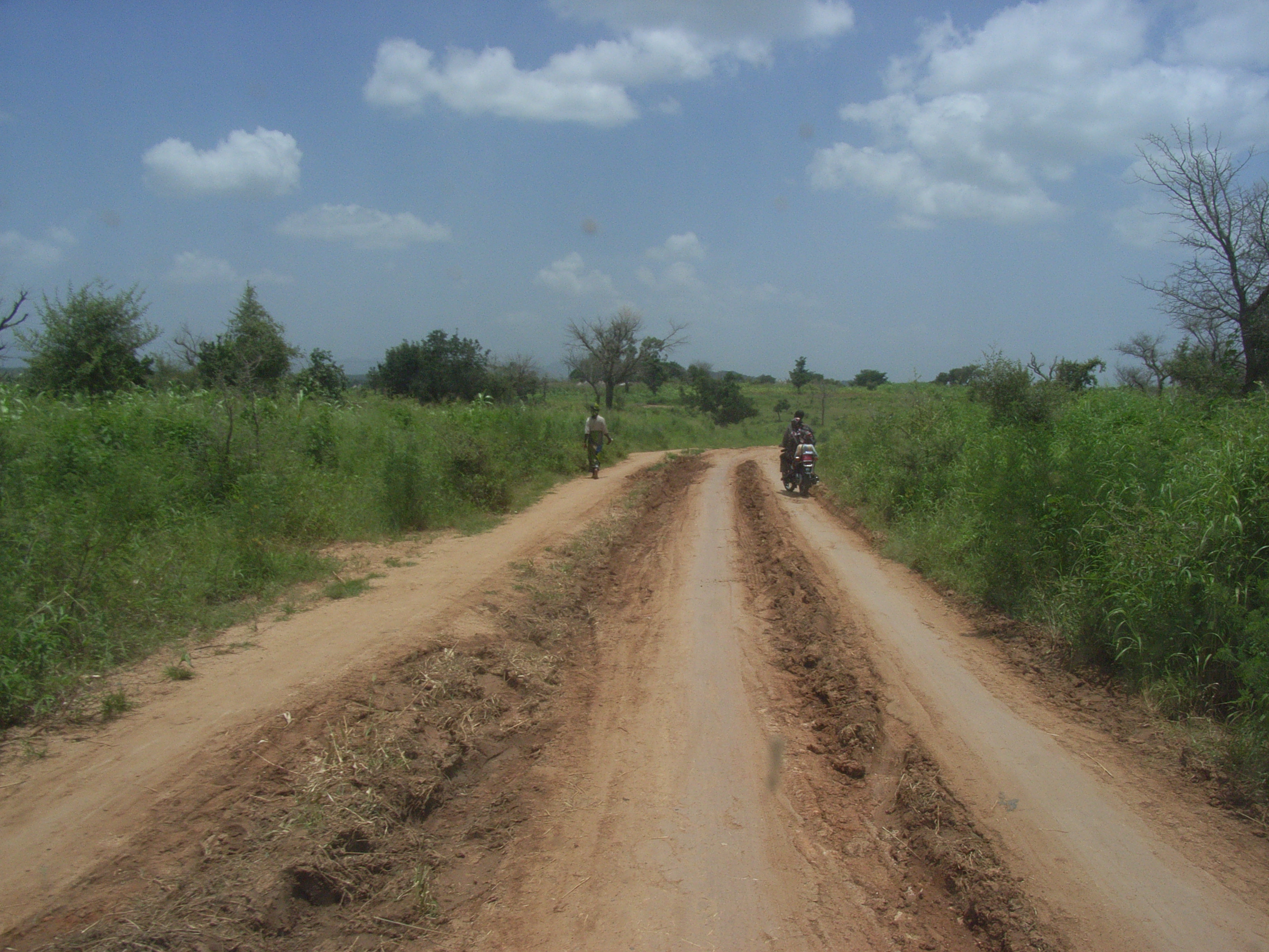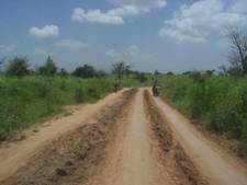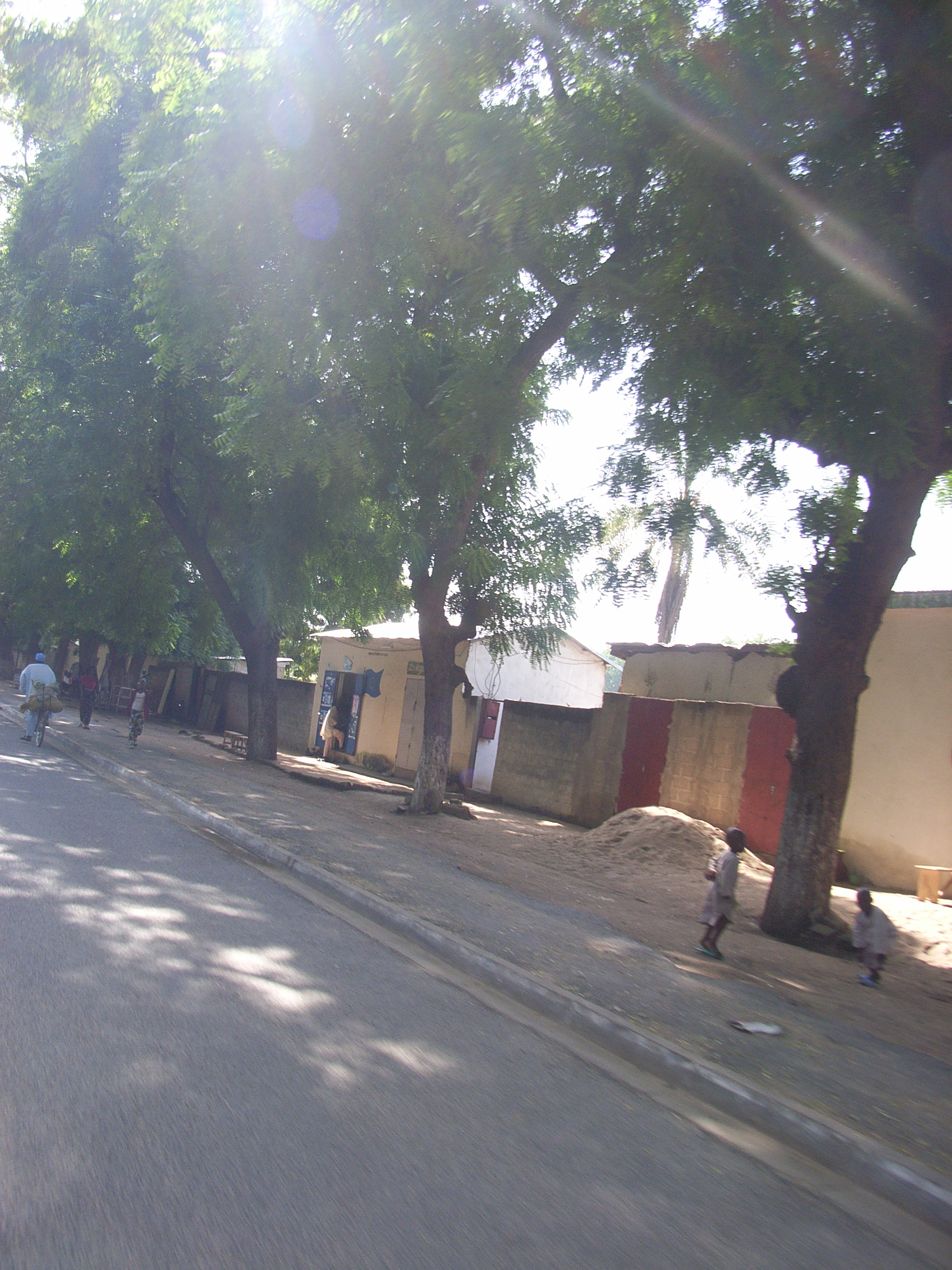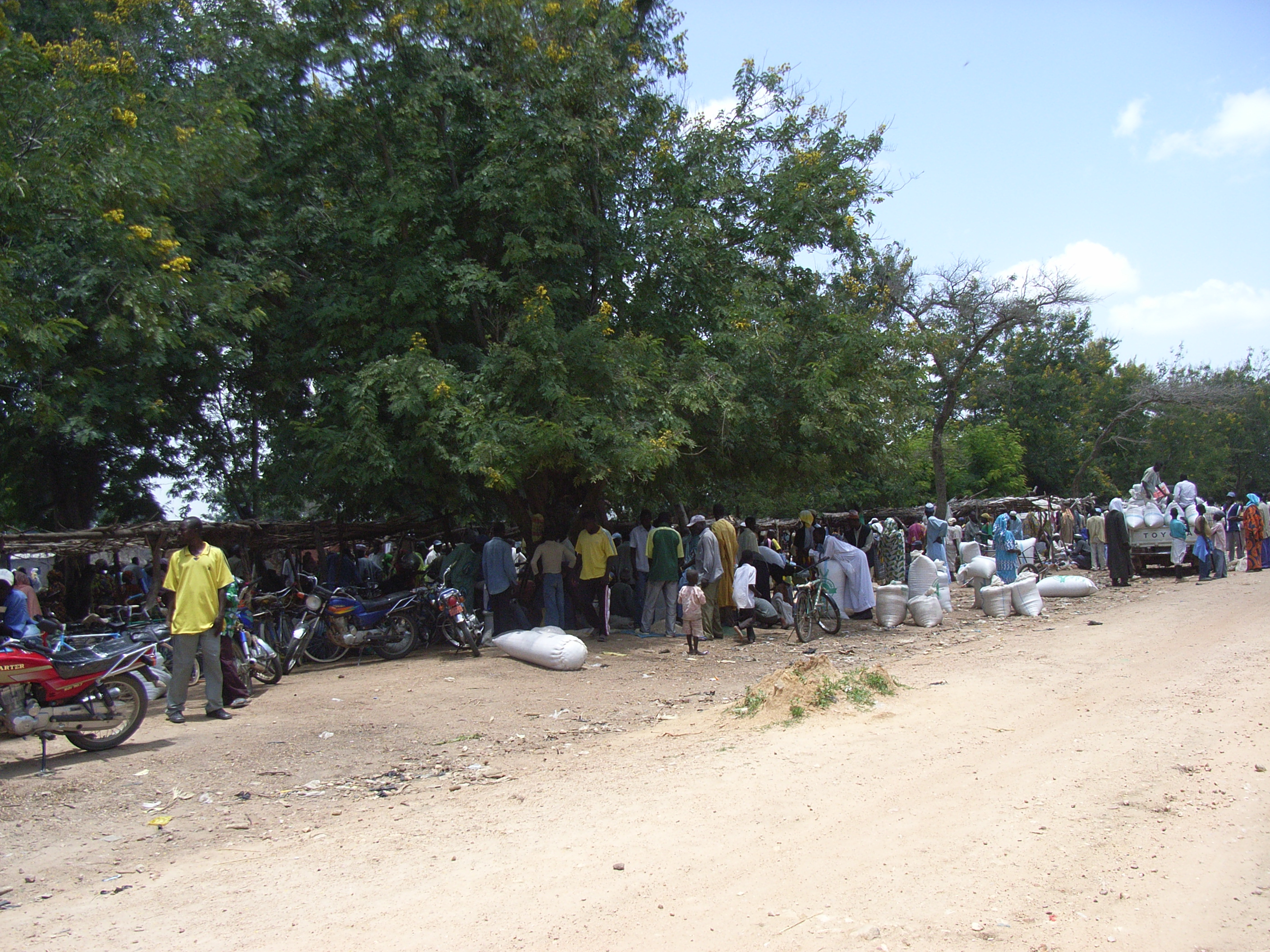 道はコンクリートで舗装されているが、幹線道路ではないので、あまり車の往来は多くない。そのため、ナイジェリアにいたときに体験したような無謀な追い抜きなどはなかったのでほっとした。道の横に小規模の市場が立っており、たくさんの人びとが集まっている。店のたたずまいは定期市のものと似ていて、ちょうどその規模を小さくしたような感じである。