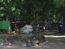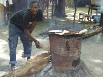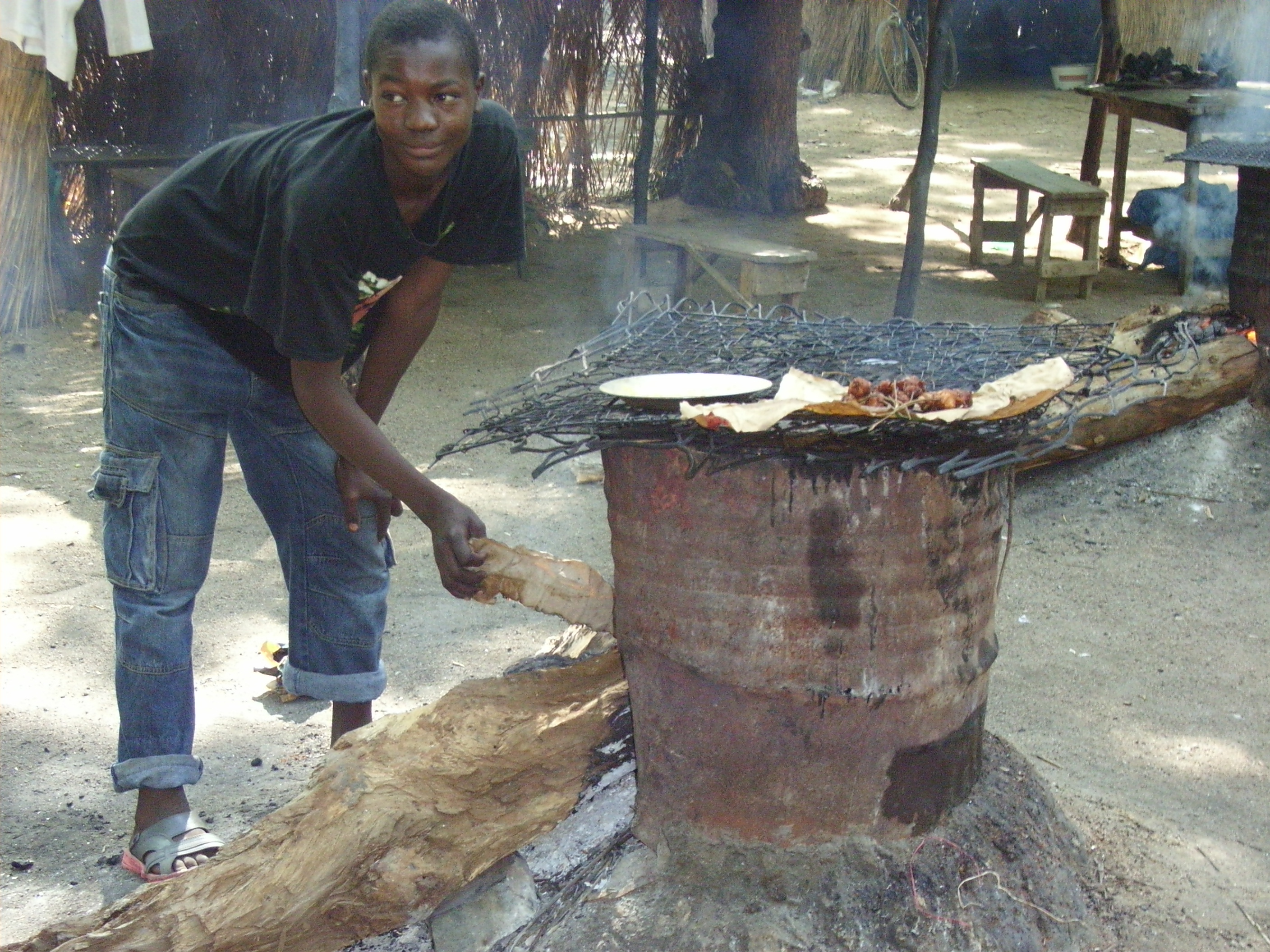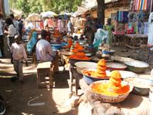 15歳くらいの少年たちがドラム缶で火をおこし、その上に網を置いて串に刺さった肉を焼いていた。他の食料品を扱う所とは離れた場所にあったので、市場に訪れる人たちに軽食を販売しているのだろう。その後に会った10歳前後の少年たちは小枝をたくさん抱えていたので、それはこの燃料に使われるのかもしれない。子供も立派に家計に貢献している様子がうかがえた。他にも、揚げパンのようなものを扱っている店があった。