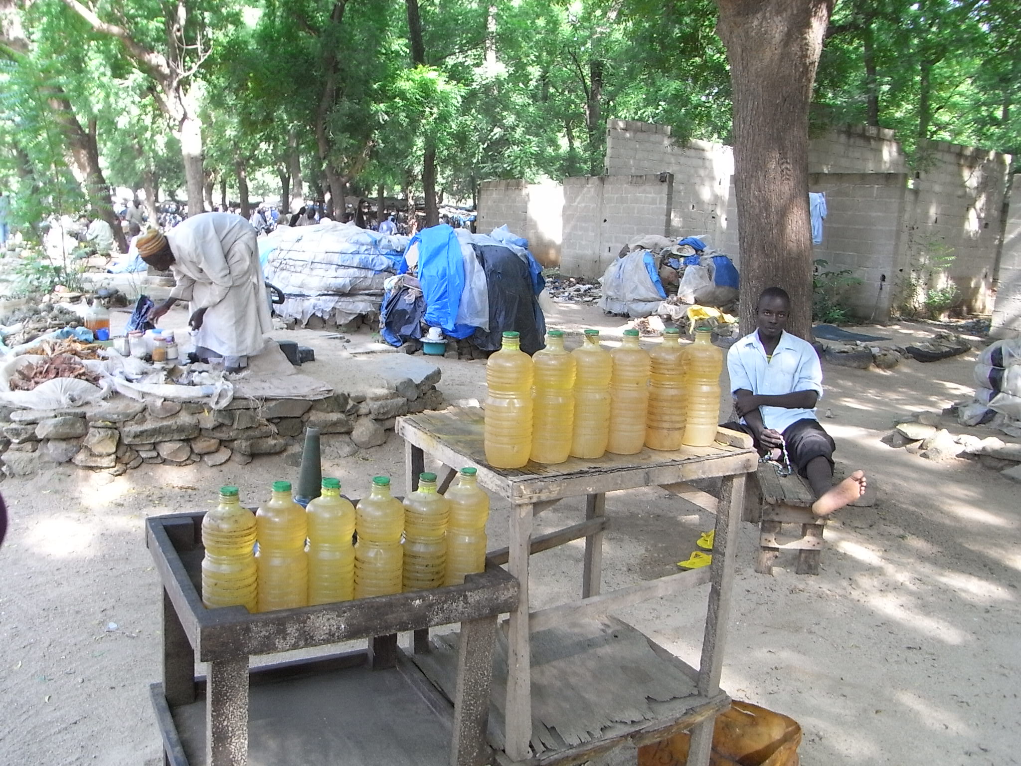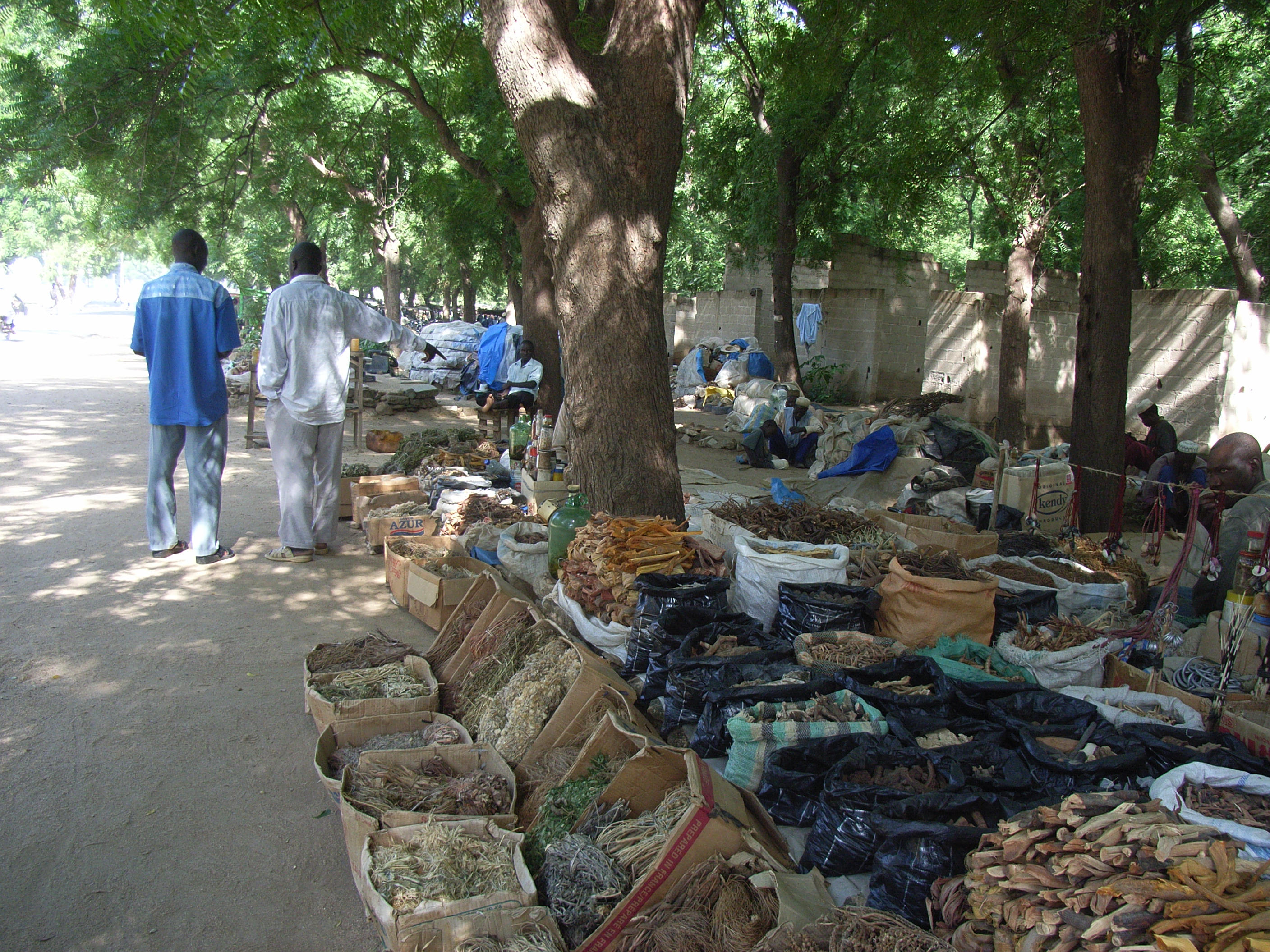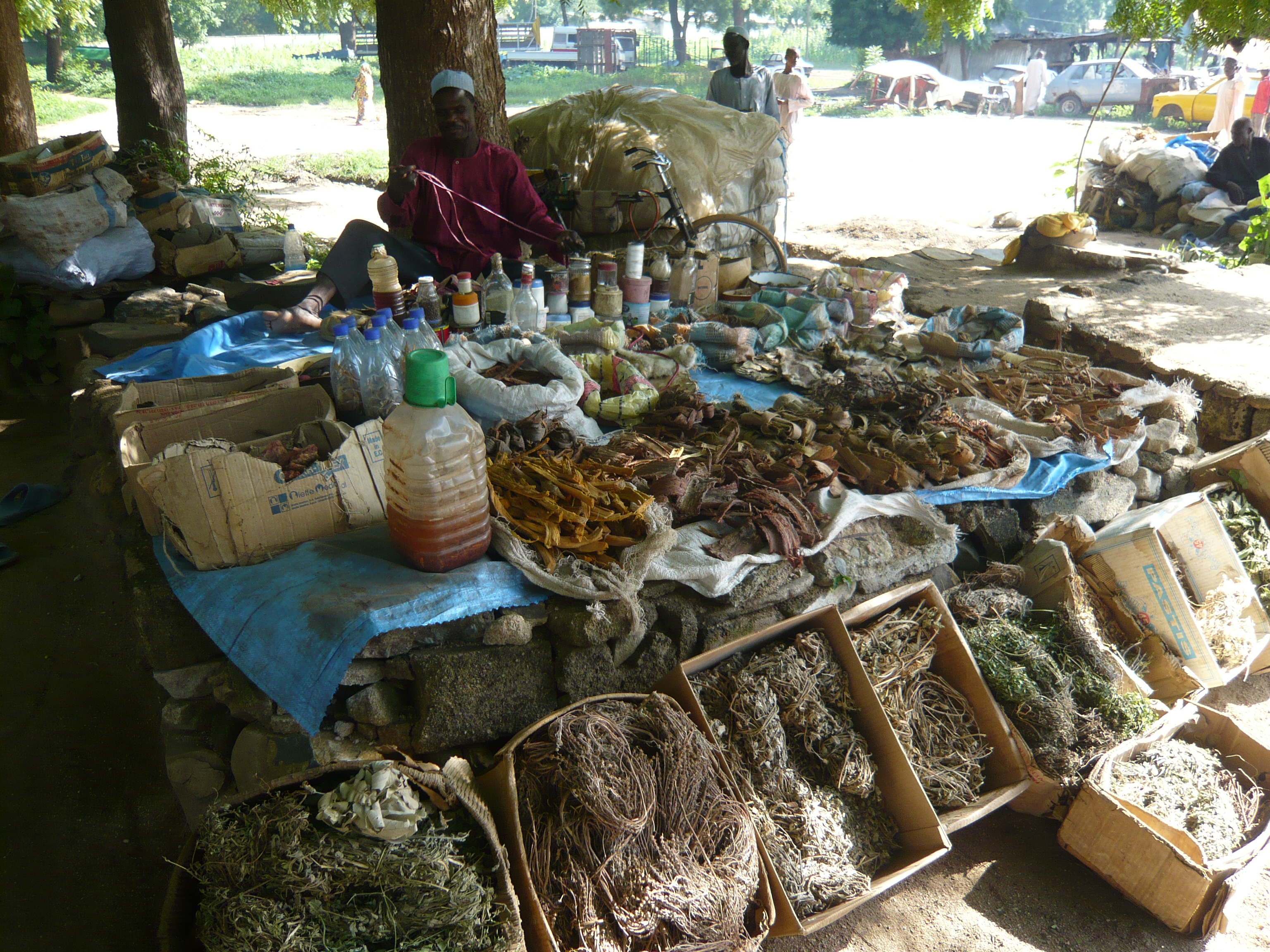 私たちははじめに、道路脇の伝統的な薬などを扱う店をのぞいた。中年のひげを生やしたおじさんがあぐらをかいて店番をしている。店といっても、木の下の2m四方のスペースに石が積んであり、その上にブルーシートがかけられているだけのものだ。そのブルーシートの上には、商品が隙間無く並べられている。木の皮、植物の根っこ、ペットボトルに入った茶色の液体、瓶に入った粉などが主な商品である。ペットボトルに入った液体は石油であると判明した。この漢方のような乾物の中には魔術に使用されるものもあるという。
