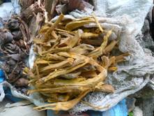 一角にあった黄色っぽい根について、店の人に説明していただいた。この商品は、プランテーンの根を乾燥させたものだという。現地で“Bepa”と呼ばれるもので、定価は500CFAである。用途はマラリアの予防で、これを水に5時間浸して、その液体を1週間に2回飲む。